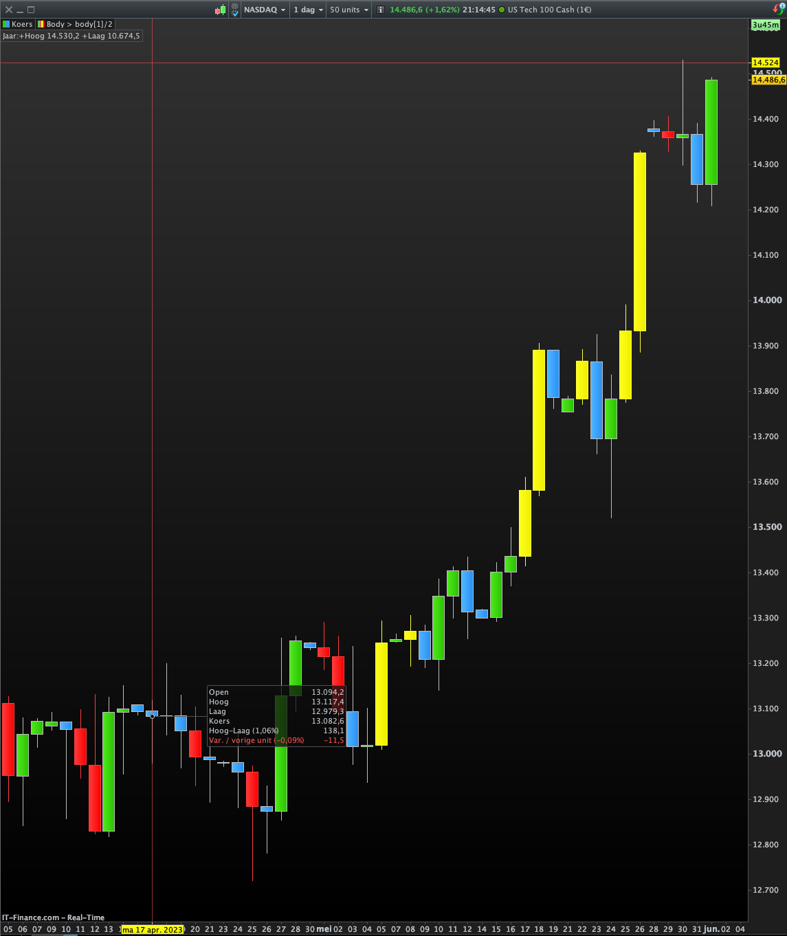 Is it possible to program: the body of the current candle is > 50% of the previous candle?