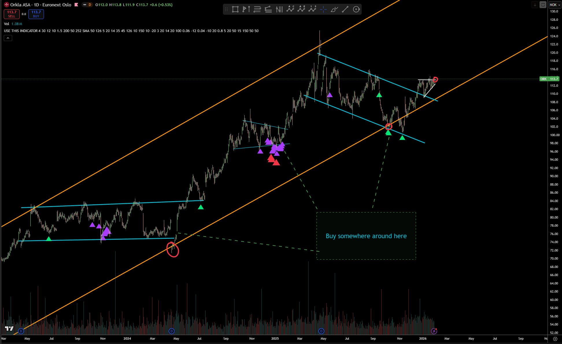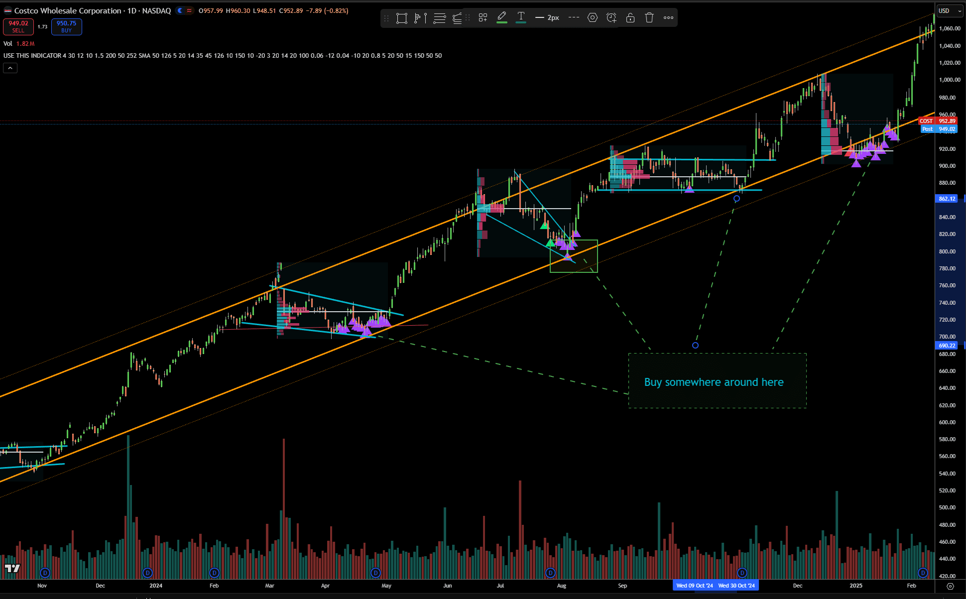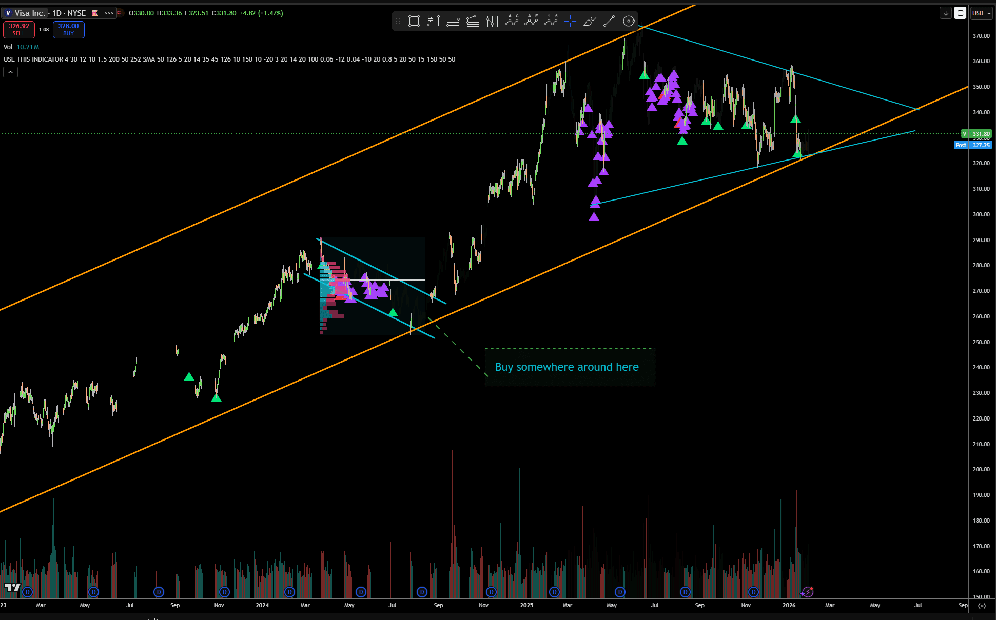 Bonus point: Get a purple or better yet, a red triangle from my custom made indicator, mainly macd, rsi, and someother indicators mashed into a simple “buy the dip signal” indicator.