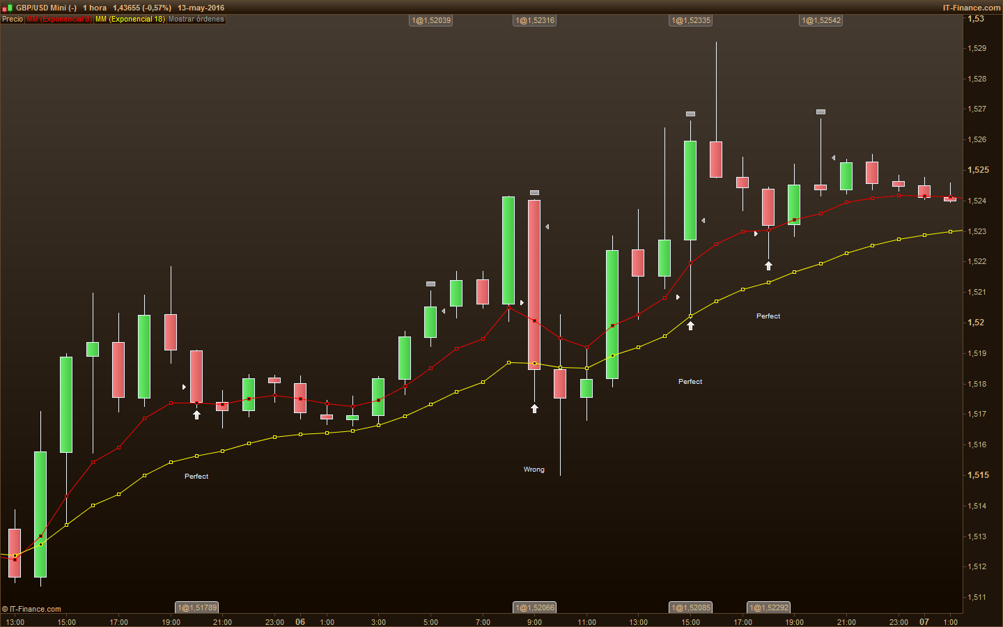 En un movimiento alcista por ejemplo, esperamos a que se forme un hueco, desde que la última barra que toque la media movil, esperamos que en la siguiente barra, el mínimo esté por encima de la media móvil y entonces tenemos el hueco formado y es a partir de ahí cuando tendría que poner la orden de compra.