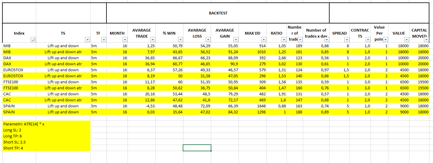 In the excel image you can find how well perform the TS with original settings on all European indexes. IG Market spreads are included (Spain and Italy do not perform too well due to the big spread that they have). also same capital is invested to compare the different indexes (around 19000 euro per index).