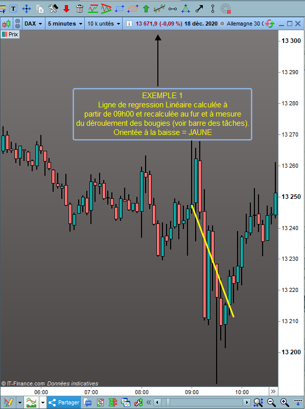 Je souhaite avoir sur un graphique (par exemple DAX 5 min), une ligne/droite de régression linéaire qui se forme à partir d’une heure précise et qui se recalcule tout au long du déroulement de la journée.