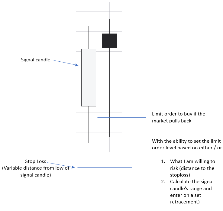 For example, for a long, once the signal candle closes, I’d want my stop lets say 5 points beneath the low and would want to risk lets say 10 points. I’d get in if the market pulls back to the level or, limit order to turn to market order if price already lower. The option of a target would be a bonus.