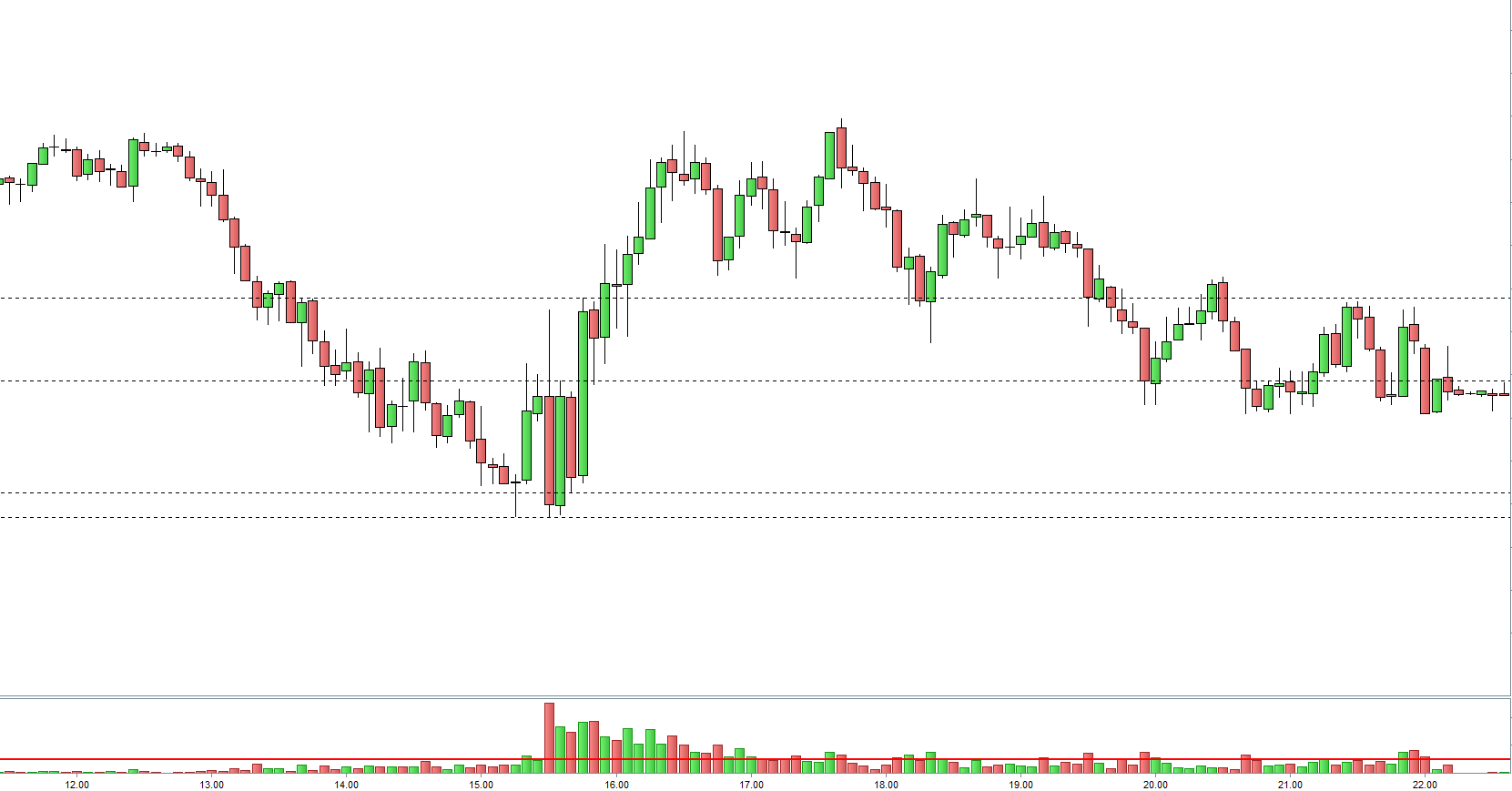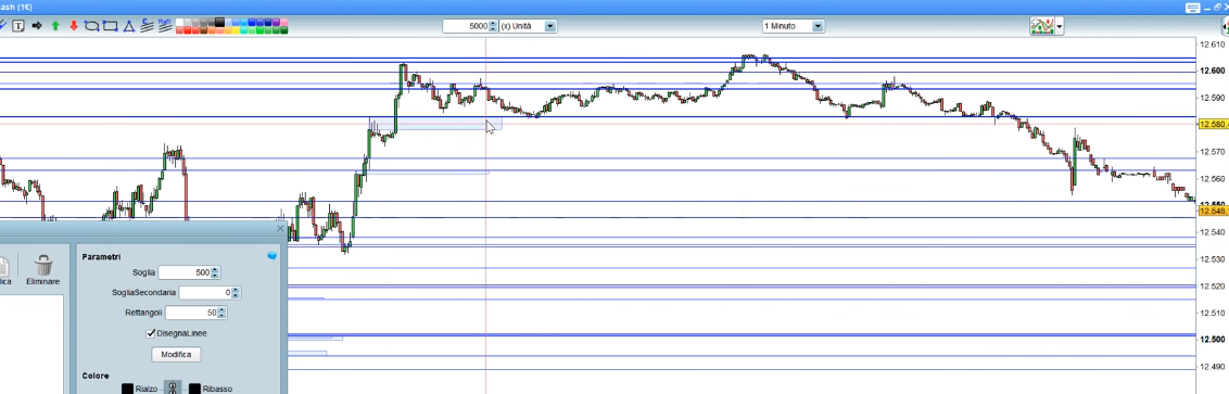 ciao a tutti, è possibile far disegnare automaticamente delle linee come in figura sulle ombre inferiori delle candele orso e superiori delle toro (quando non ci sono le ombre invece sarà il max o min) in base alla candela se è uguale o superiore a un valore di volume da me indicato? es: indico un valore di volume di 4000 su tf 5 min mi segna con delle linee (supporti se sono orso/resistenza se sono toro)