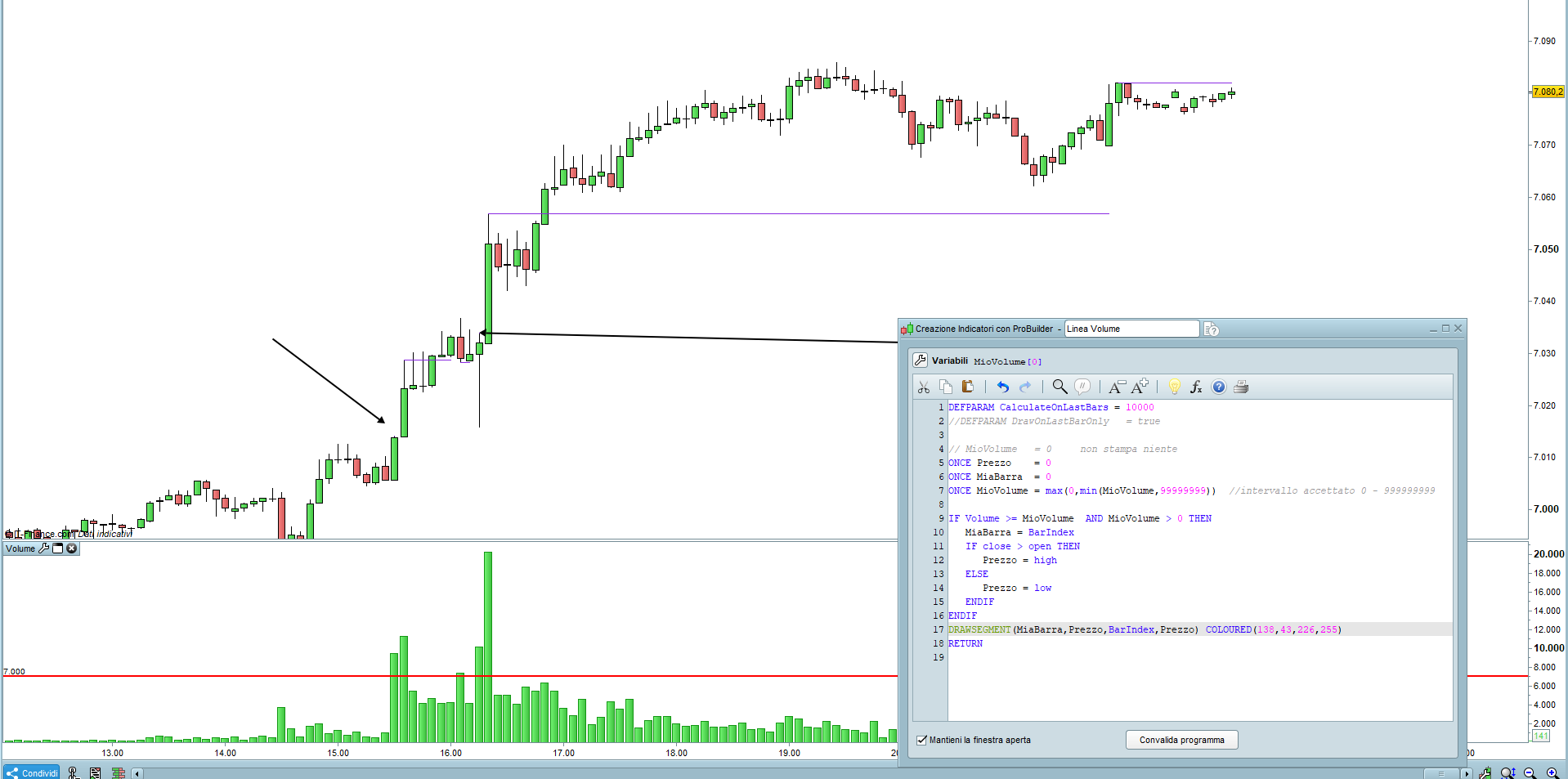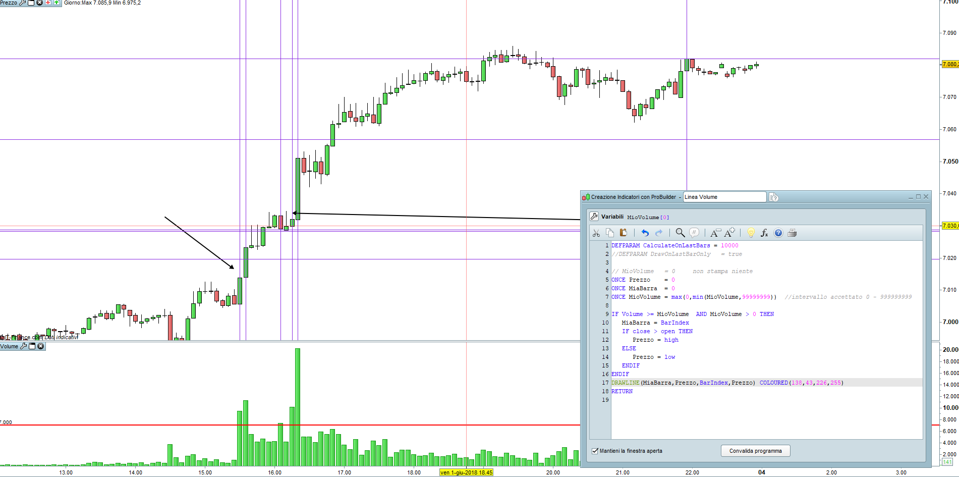 Allego anche il file da importare, con la variabile dichiarata MioVolume dichiarata in modo da modificarla dalle proprietà dell’indicatore.