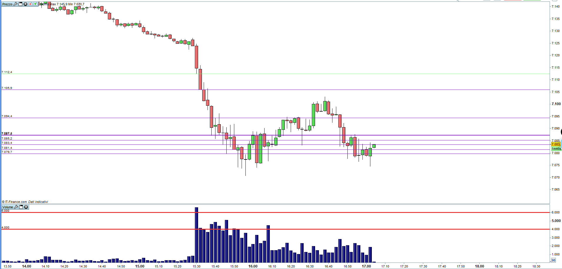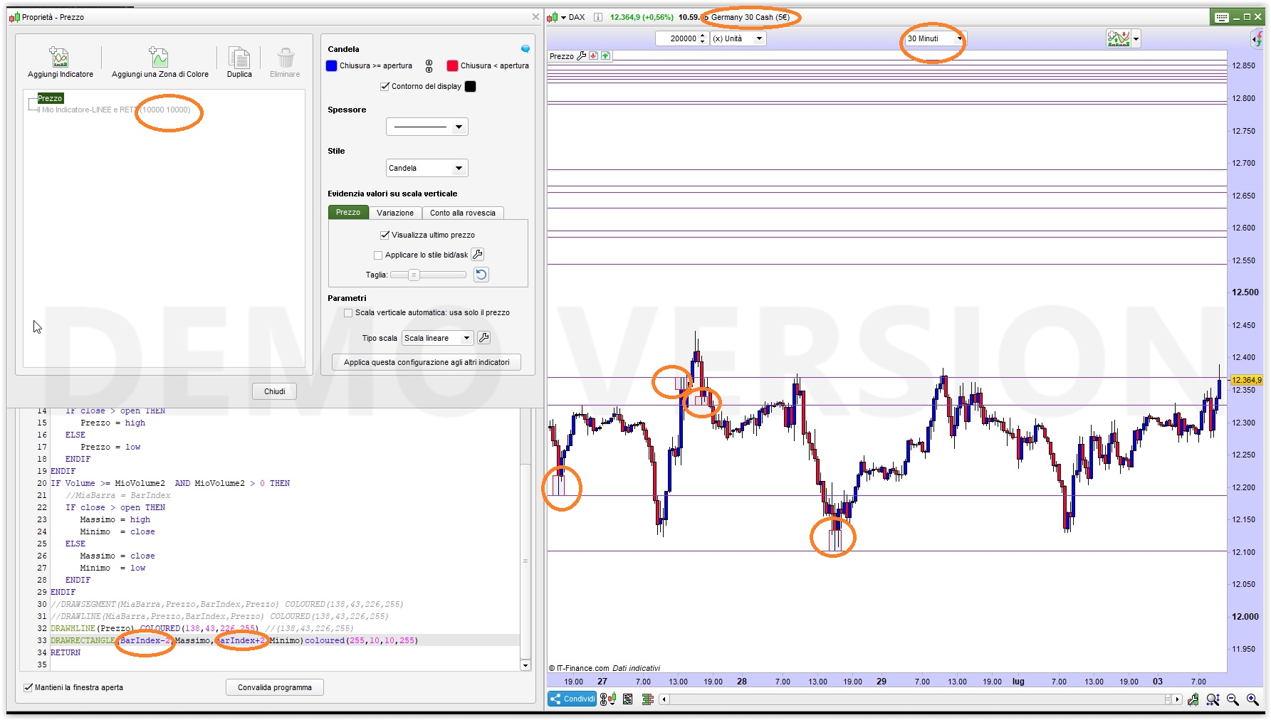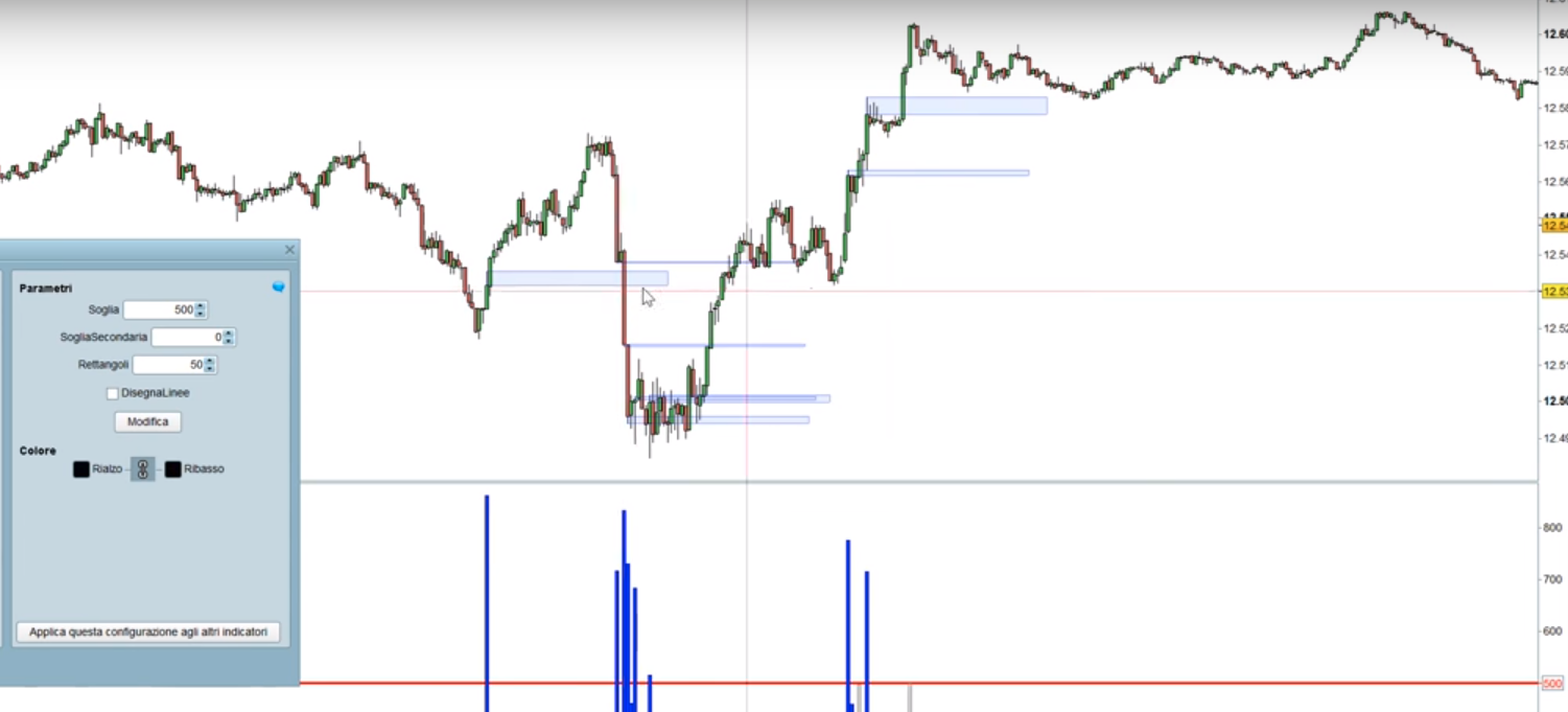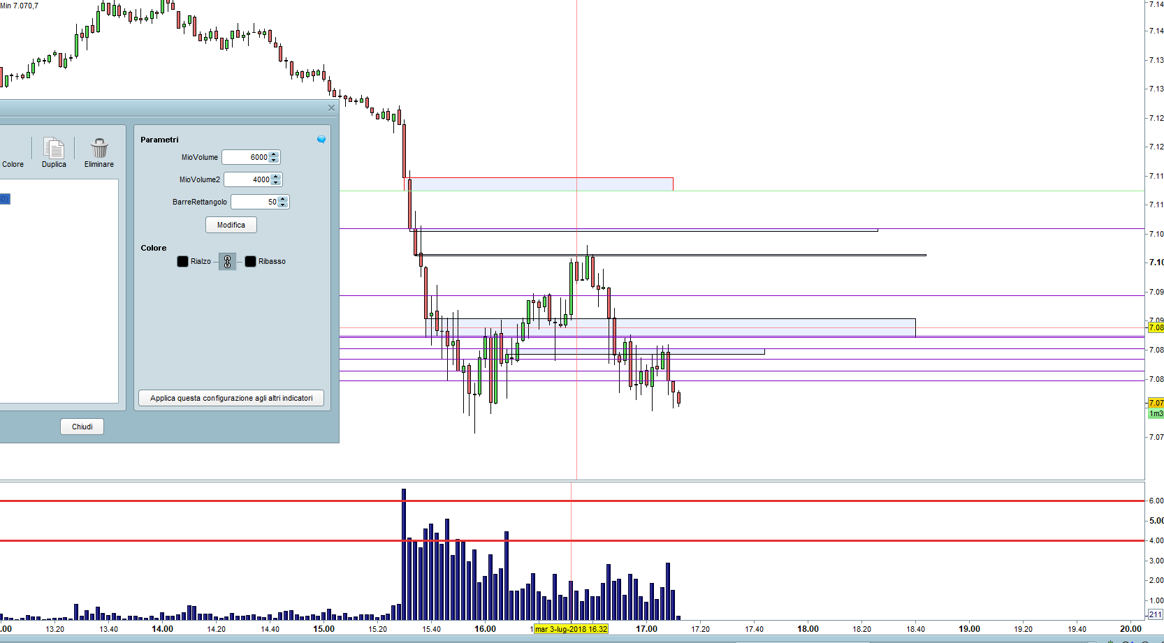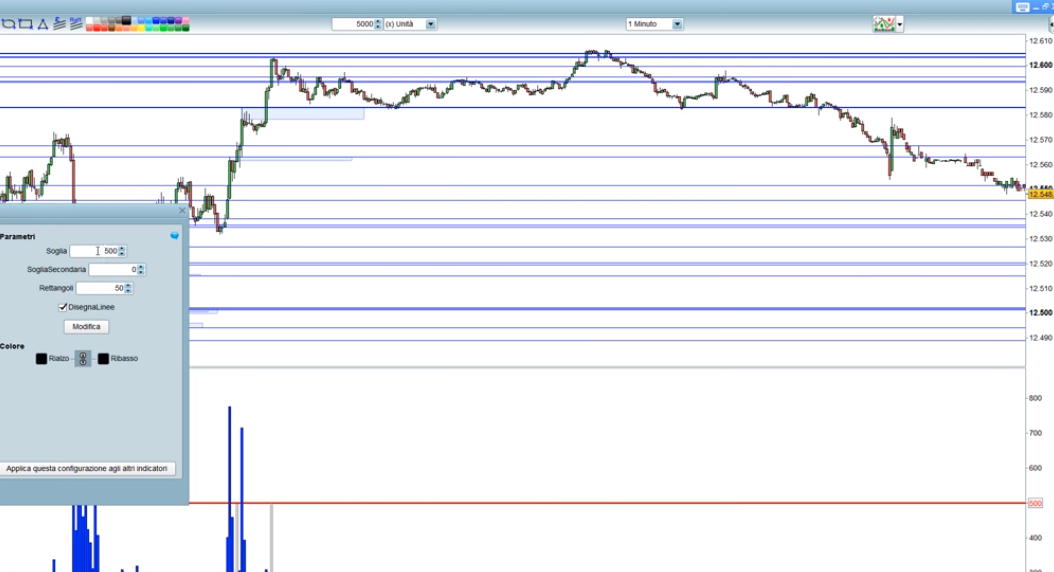 Se, all’inizio, indichi un numero alto di barre oppure non indichi il parametro CALCULATEONLASTBARS otterrai un grafico illeggibile pieno di linee orizzonatli. Eventualmente inserisci dei limiti di voilume molto alti. Io le prove le ho fatte sul DAX €1 a 15 minuti con volumi di 10.000 per entrambi i valori.