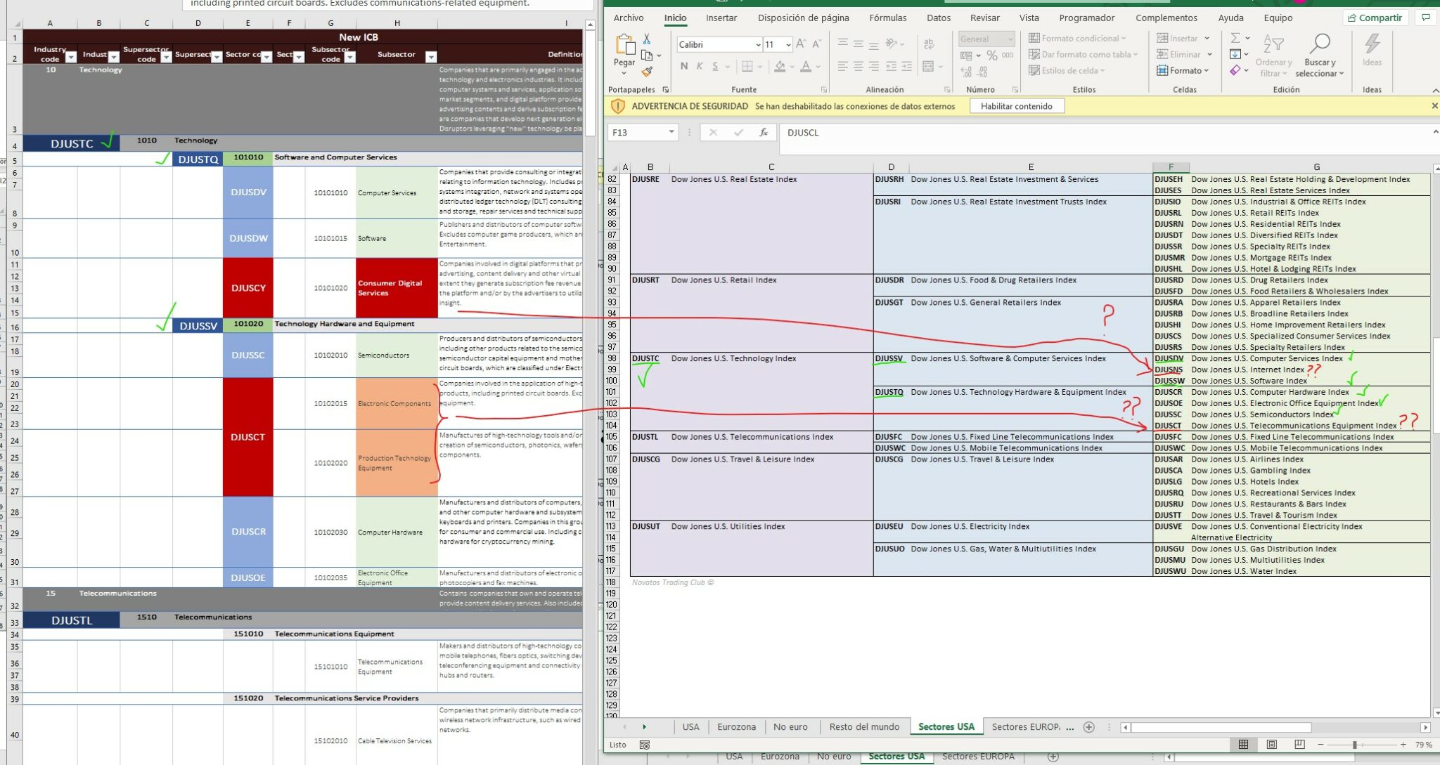 - I have started the created a list for each supersector, that will include internal sector codes; In levels of blue background are the codes manually filled by me, in red background my doubts.