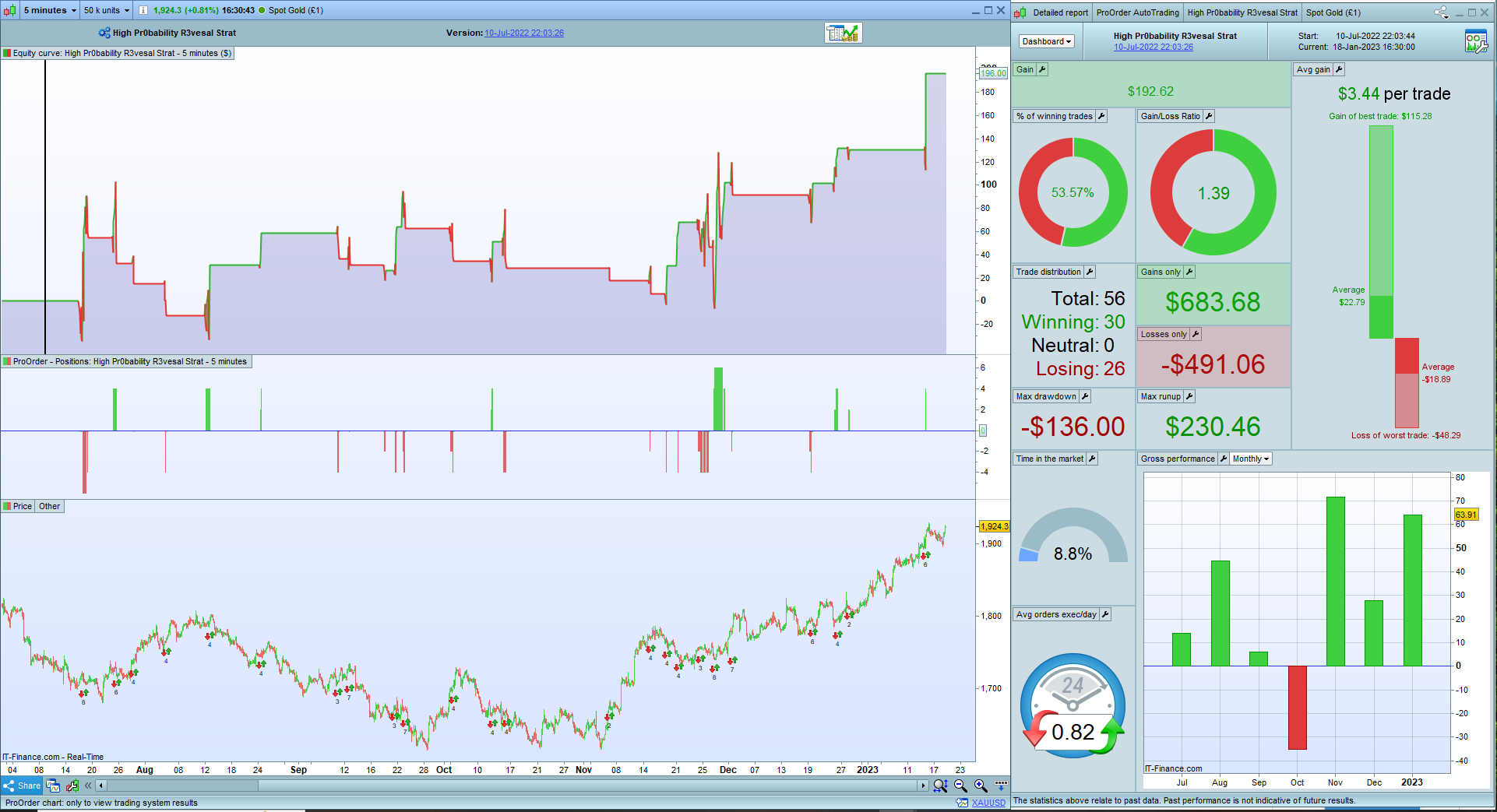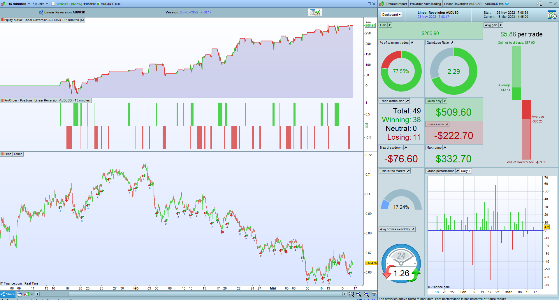 For a some much more positive news my other strategy Linear Reversion Trader (prorealcode.com) has been doing exceptionally well during the same period. It is currently maintaining a win rate of 77.55% and a gain to loss ratio of 2.29. I have attached the results for your viewing.