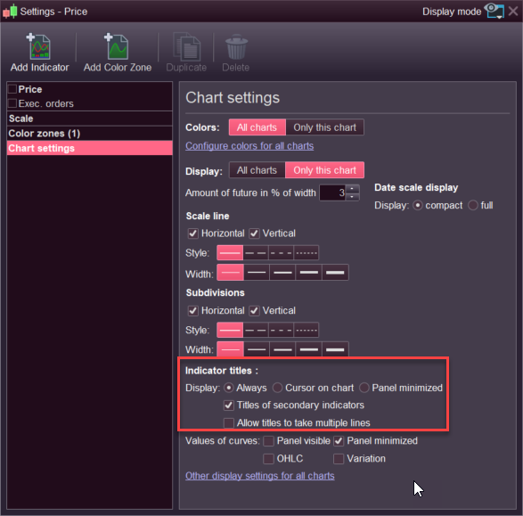 With PRT v11, you can “hide” the names of the attached indicators on the price chart. This option is available in the “Chart settings” section of the price settings window (see attached picture).