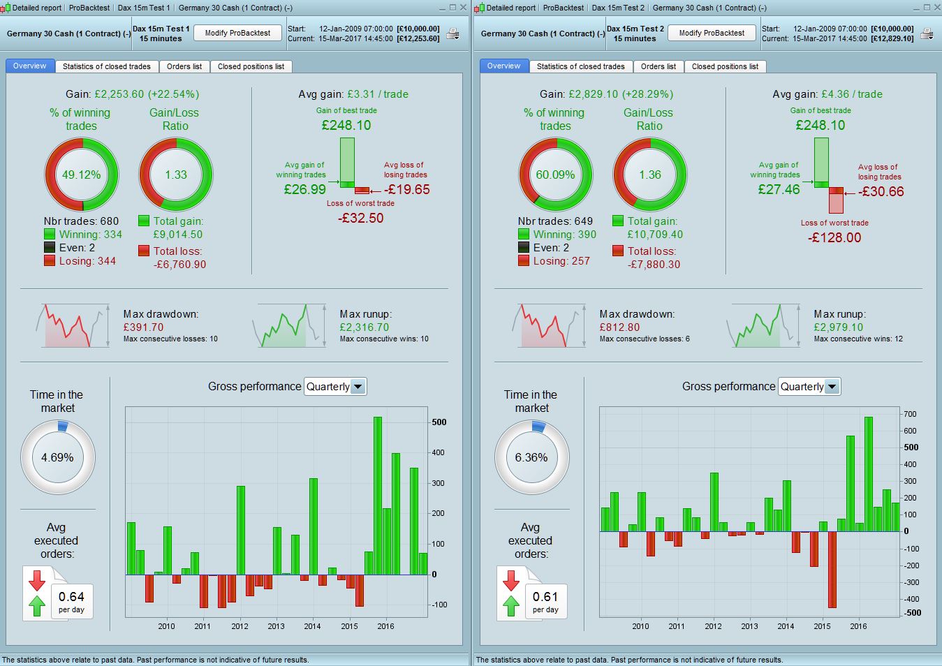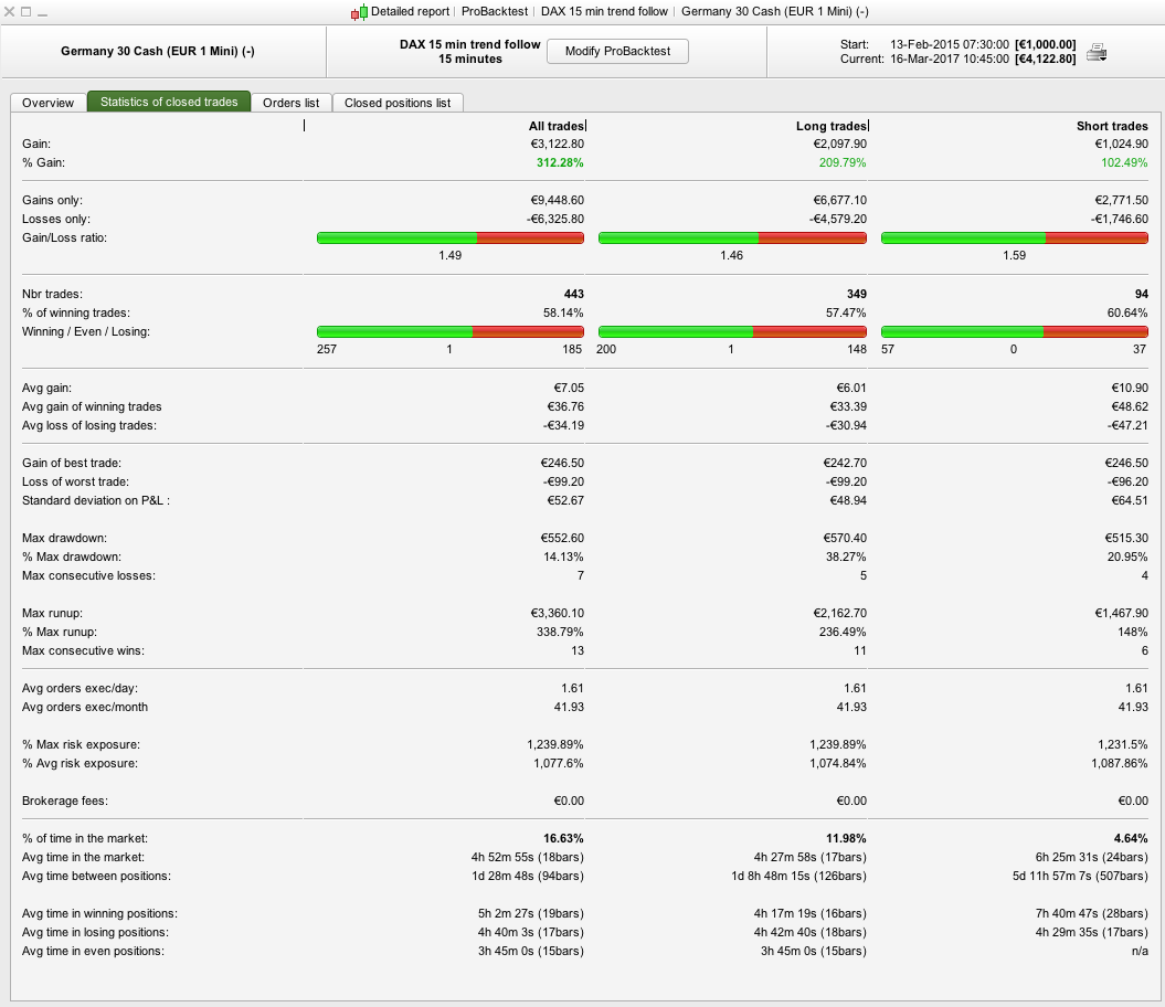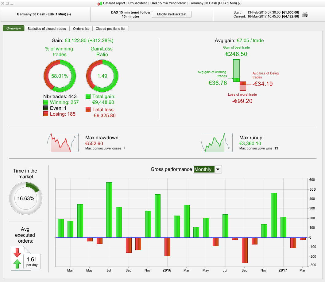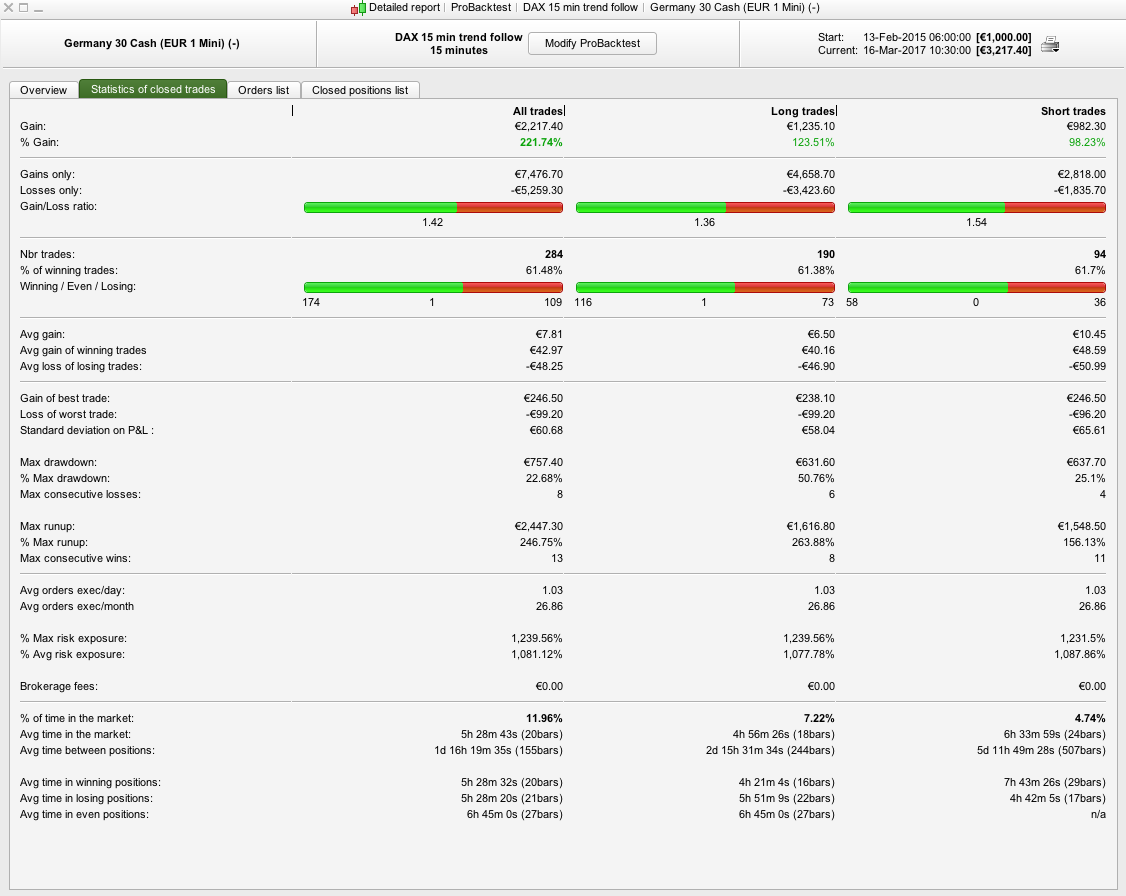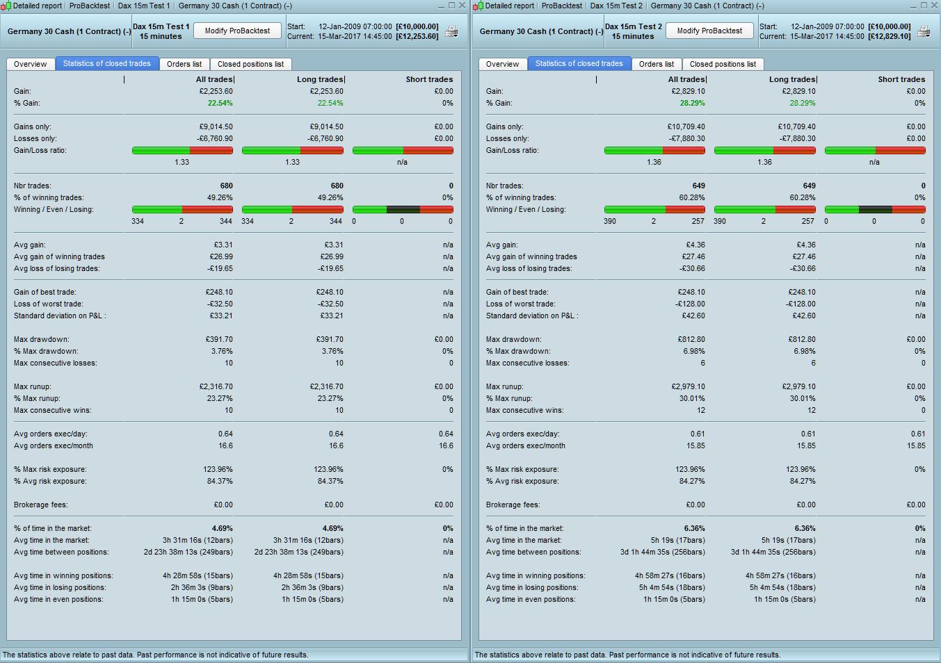 I have attached the results (Test 1) together with amending the stop loss to 0.9% (Test 2) as a % based stop loss provides better results given that the DAX was half its current value back then. It produces better results but still needs some improvement. The draw is still only 7% which is pretty good. I’ll have a think about other ways you can improve. Have you optimised anything yet ? It doesn’t look like it, so together with the low draw of 3-7% you’re off to a good start.