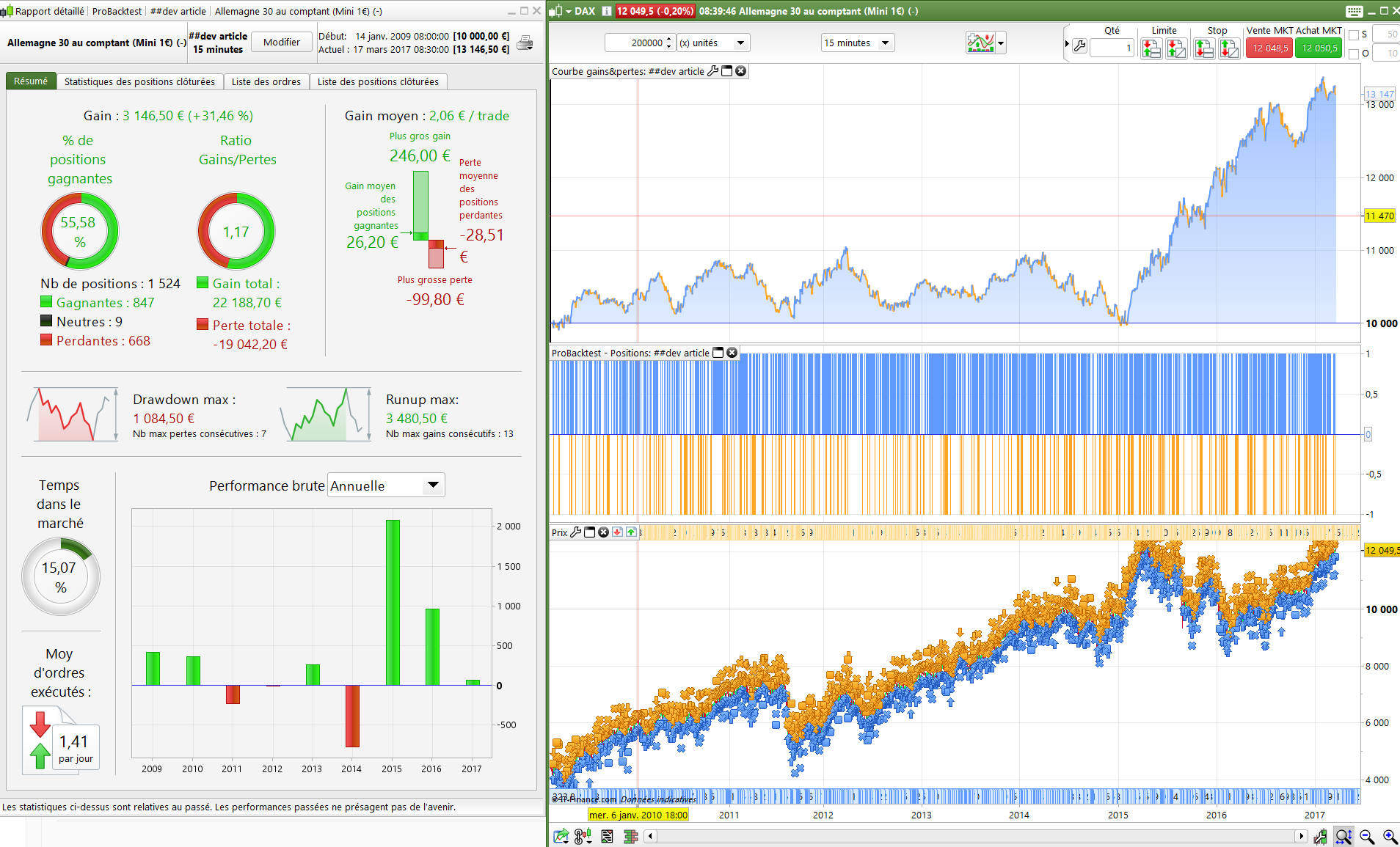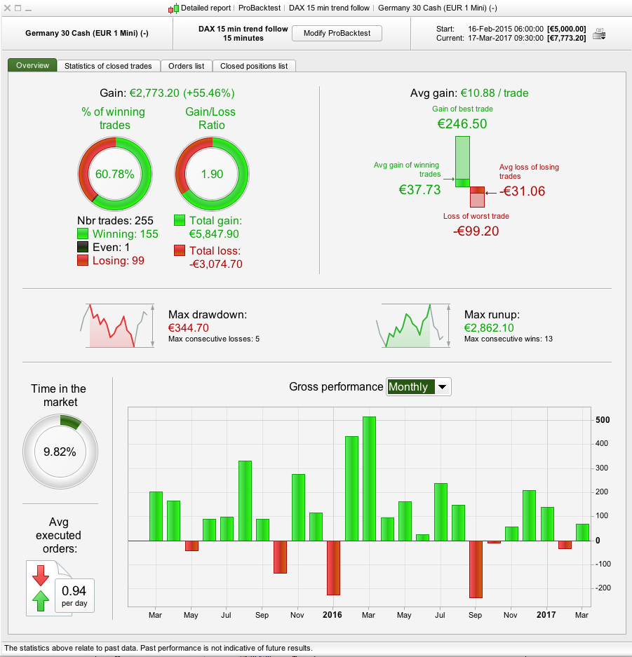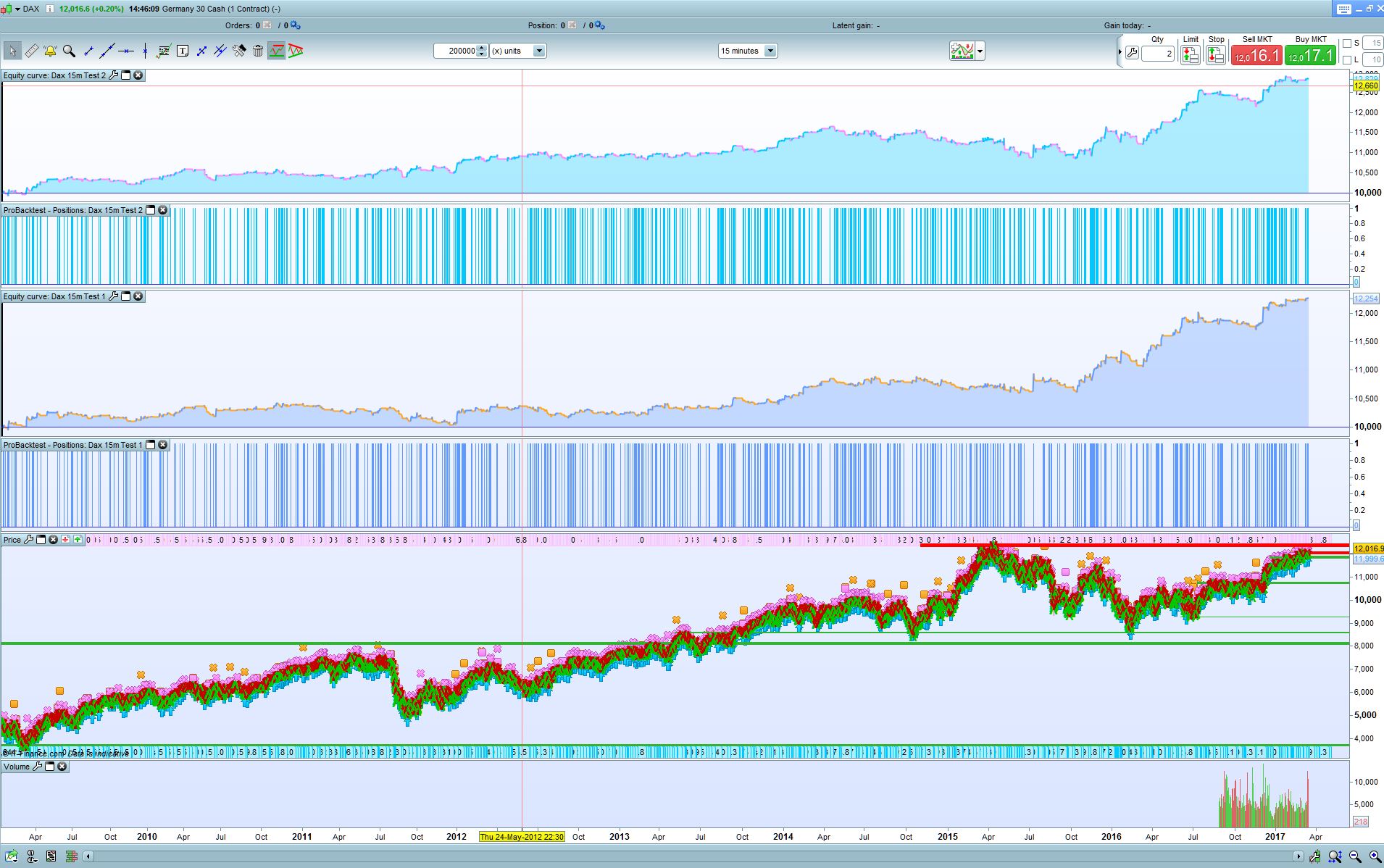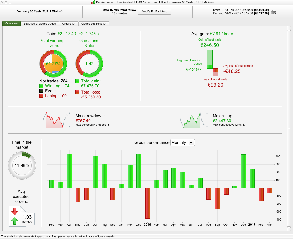 I have attached the results (Test 1) together with amending the stop loss to 0.9% (Test 2) as a % based stop loss provides better results given that the DAX was half its current value back then. It produces better results but still needs some improvement. The draw is still only 7% which is pretty good. I’ll have a think about other ways you can improve. Have you optimised anything yet ? It doesn’t look like it, so together with the low draw of 3-7% you’re off to a good start.