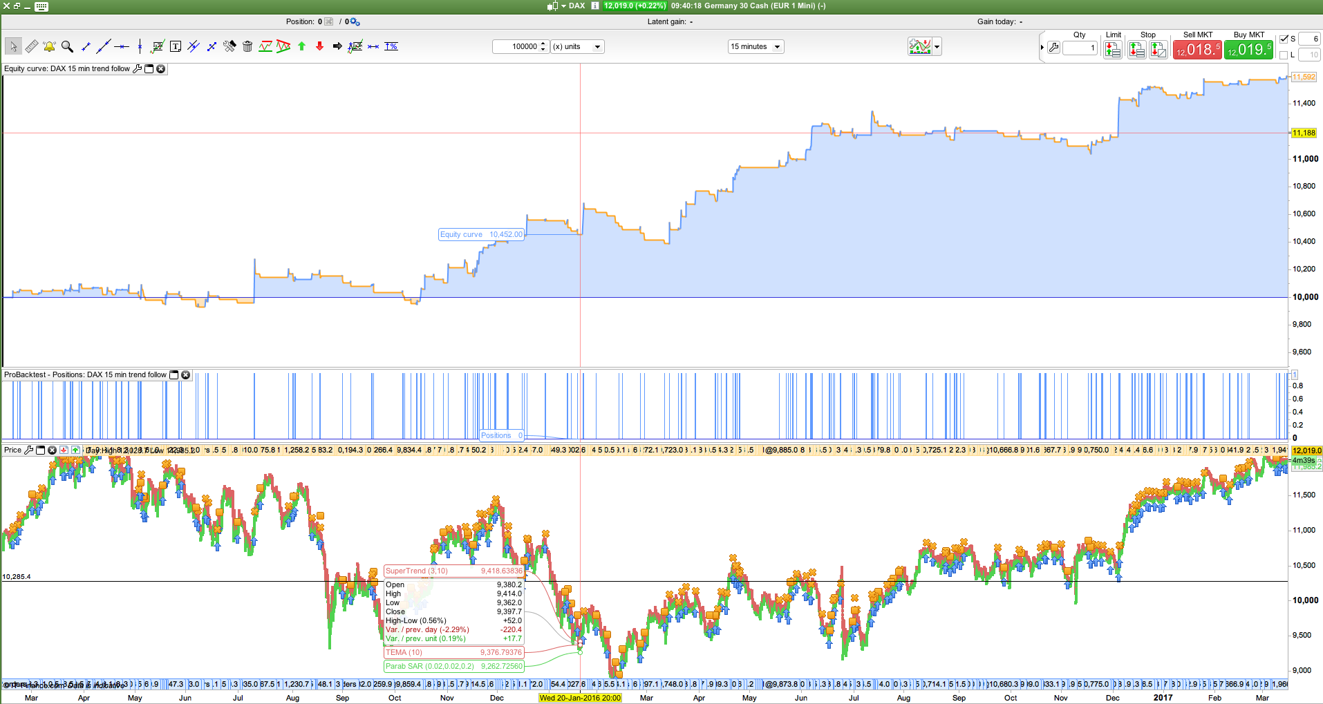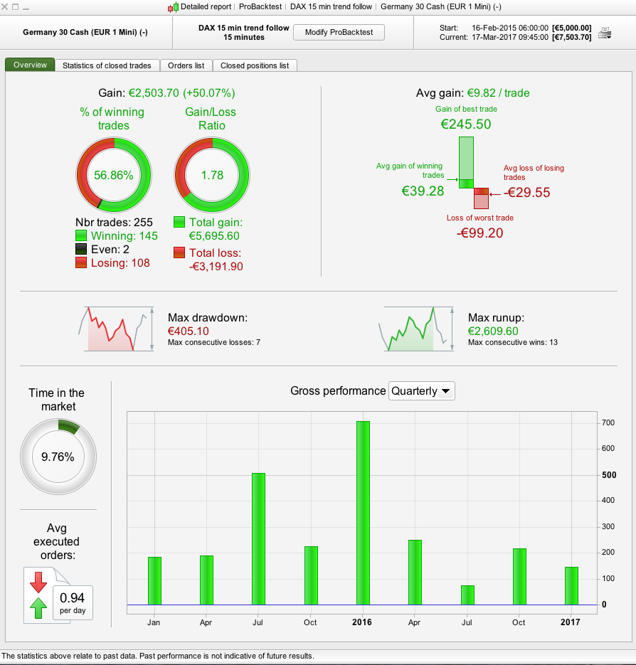 I just started working on a system which is buying pullbacks on Dax 15 min. I would be grateful if anyone had the possibility to test the system on a longer history. The % of winning trades are not very impressive so if anyone have suggestions on how to improve this I would be grateful to hear them. I’m a beginner when it comes to this so any feedback on how to optimise the code is appreciated!