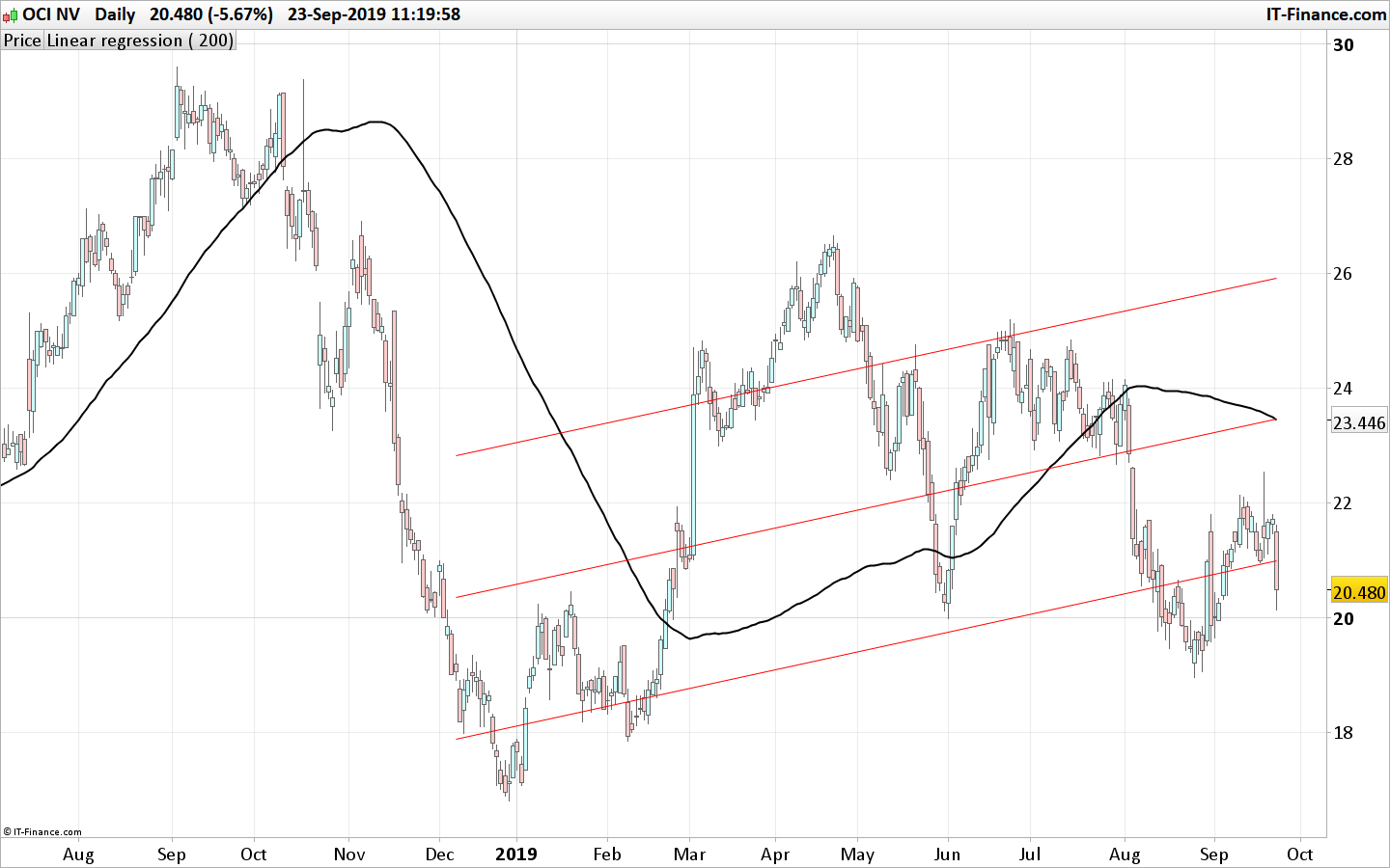 sto testando il codice del Regression Channel su un time frame daily ed ho notato che impostando un periodo maggiore di 136 (Len = 137 per esempio) il canale non viene più disegnato sul grafico del prezzo.