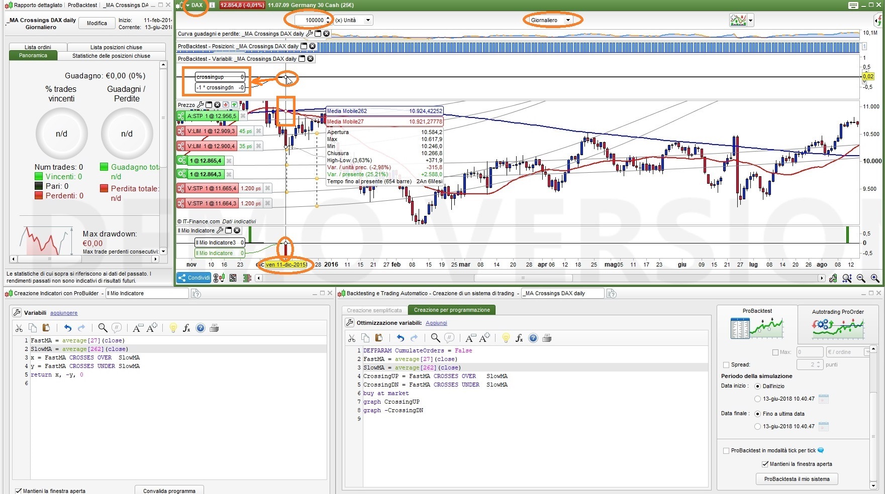 Hi Roberto, assuming this is ig cfd dataflow, not futures? If yes, I don’t see the ig sunday candles on your daily graph (just a quick check made on the sunday nov 29th 2015), so I suppose you’ll have a difference in calculation of daily moving averages coming from backtest run on prt servers (adding a sunday candle to the daily chart), while your indicator on your pc seems to be customised with the classic 5 day week (no sunday candles) for probuilder…