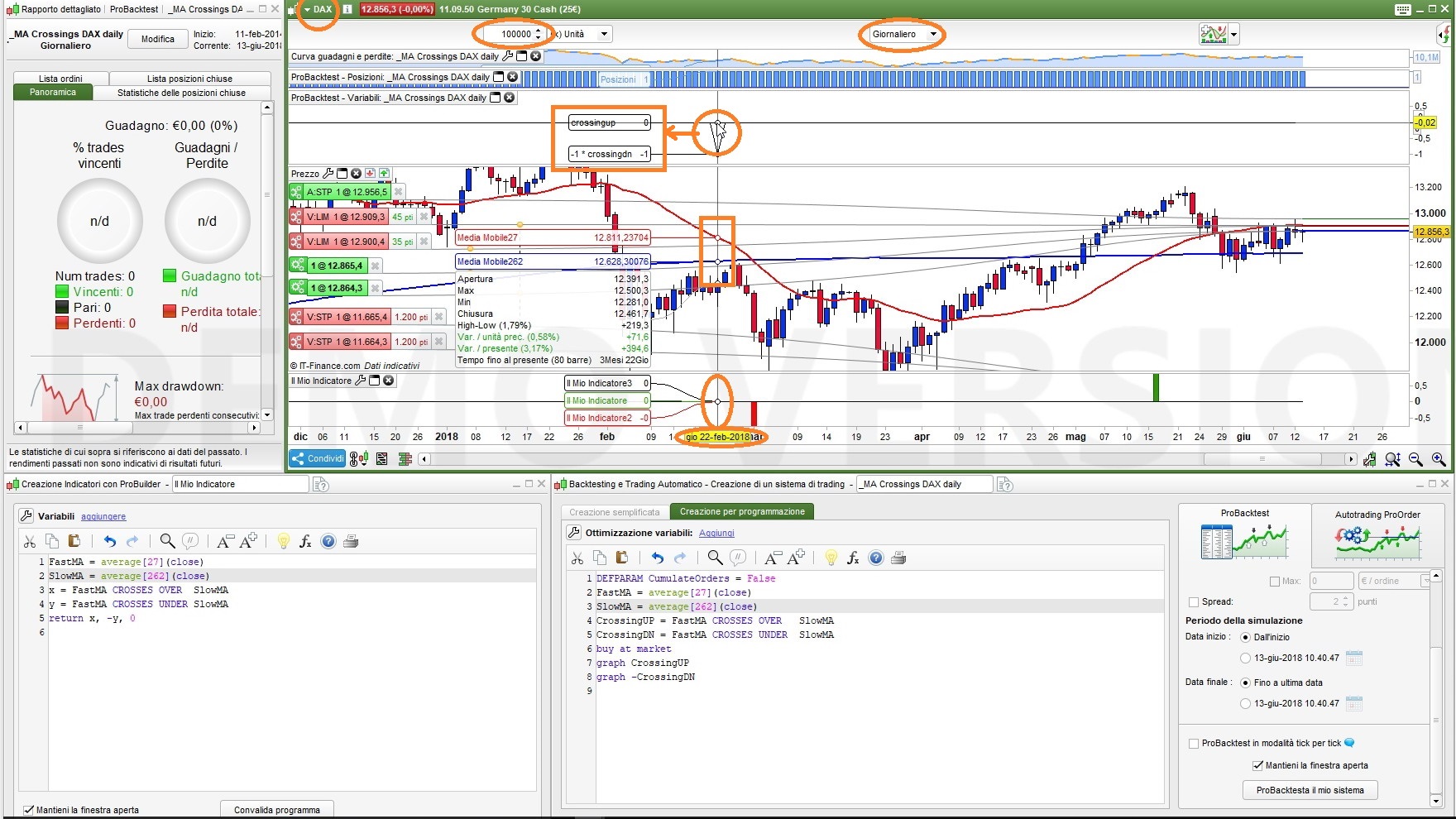 I’ve put two identical strategies on there – one graphing the averages and one graphing the CrossingUp and CrossingDn and also the indicator is on there.