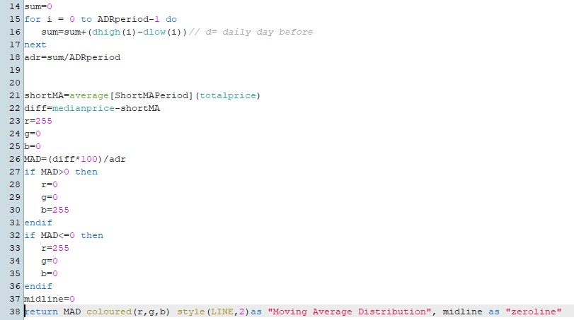 return MAD coloured(r,g,b) style(LINE,2)as “Moving Average Distribution”, midline as “zeroline”