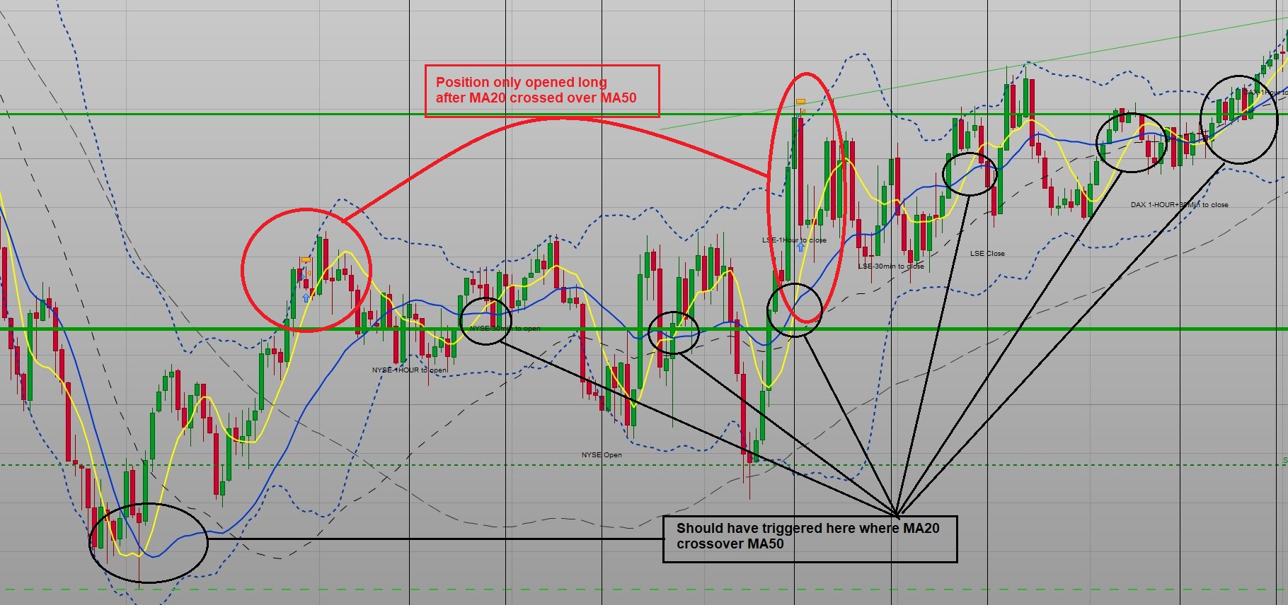 Only thing I can think of why the code does not trigger at the right time is because I use MA ZeroLagExponential (-2) Horizontal shift and MA ZeroLagExponential (in general)