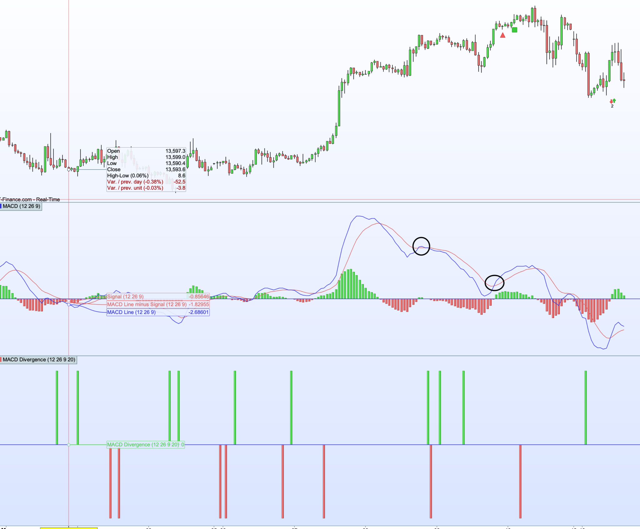 I’m still quite new to the world of prorealtime and was hoping someone could help. I’m trying to code a strategy based on macd divergence. The default one does not correspond to what I was expecting. If you see attached I was expecting bars to show up on corresponding to the circles – both sell signals. Is there a bespoke code for macd divergence?