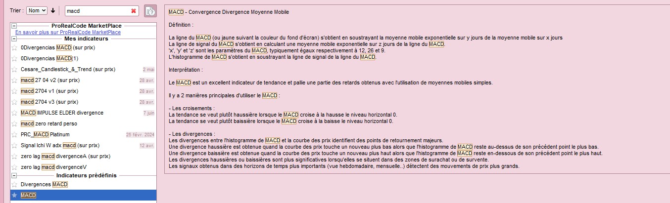 Bonjour, j’utilise fréquemment MACD indicateur fourni par défaut dans prorelatime; Cependant le code n’est pas visible et il ne peux s’appliquer qu’au panneau inferieur. Pouvez-vous fournir un code équivalent modifiable que je puisse appliquer au graphique du prix SVP?