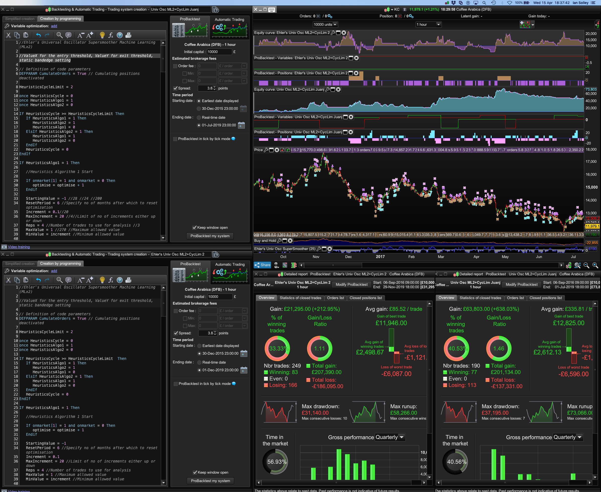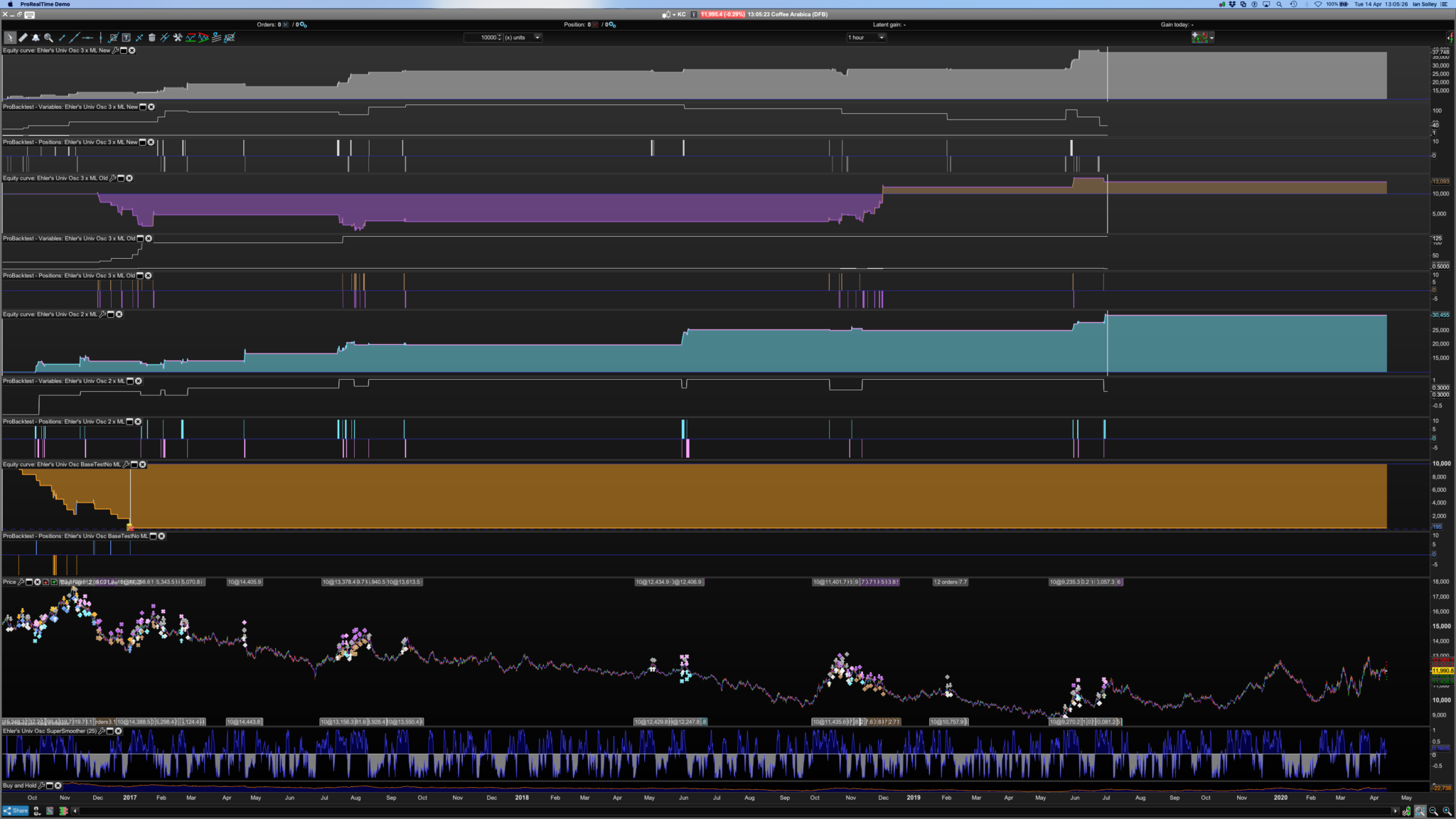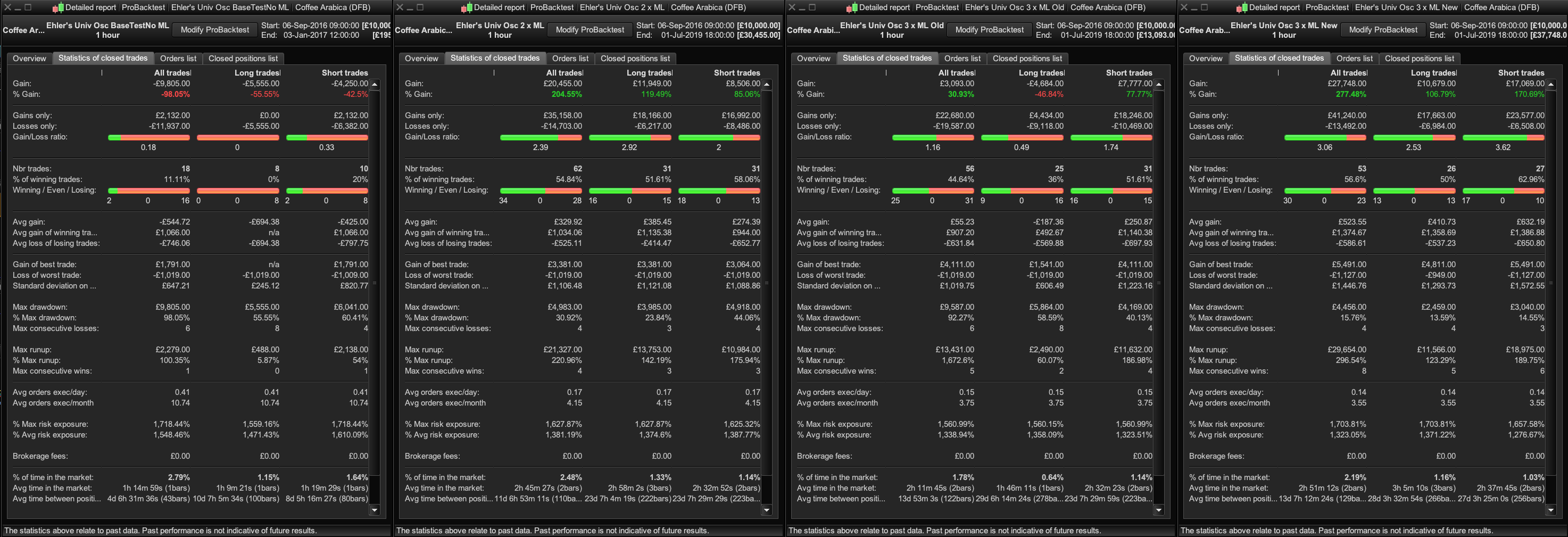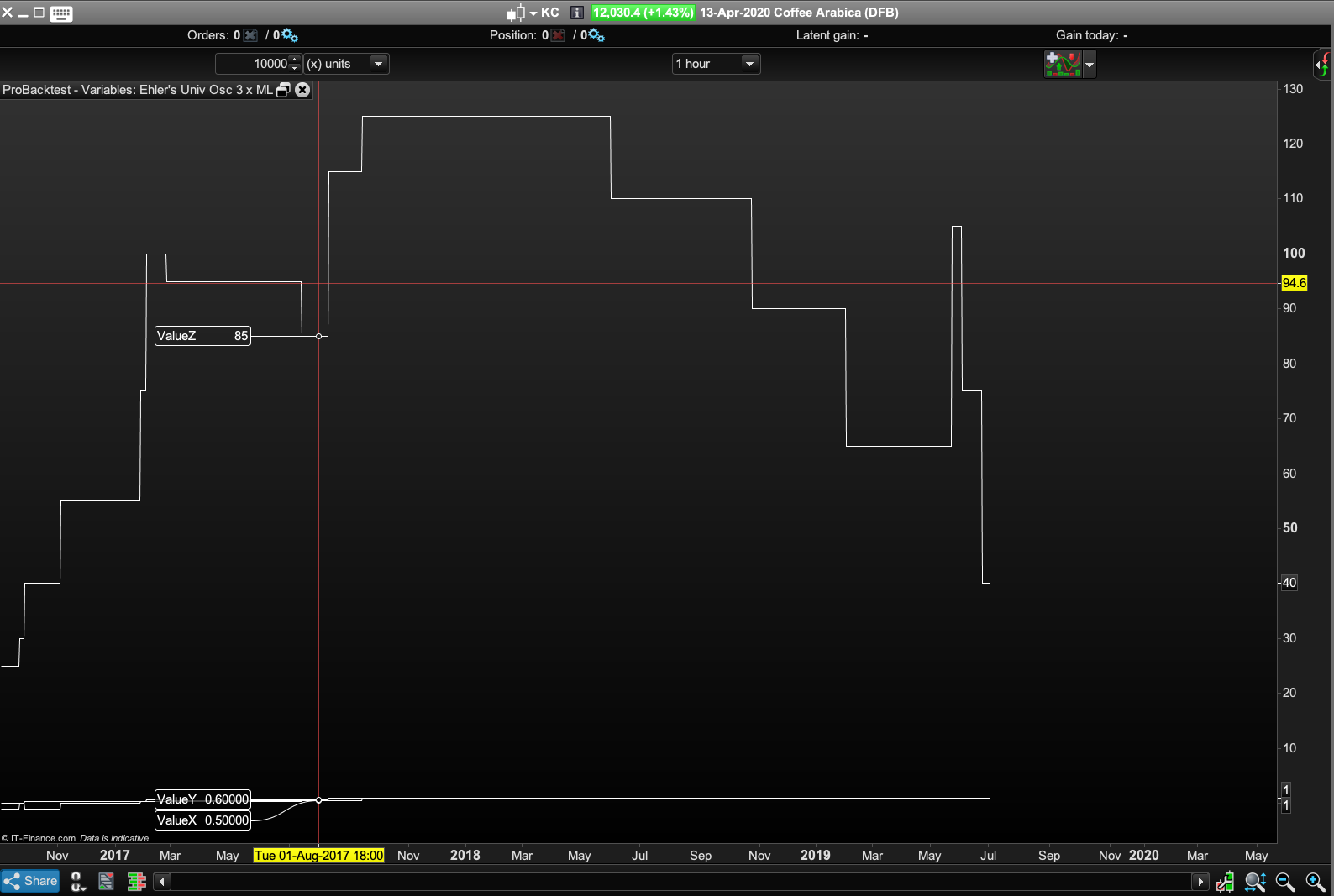 It’s very hard to know… but I expect Juanj is correct in that it’ll make it difficult for the system to know what is increasing its profit expectancy. But I just had to see what would happen and experiment with it…. Below is the evolution with coffee, (I thought I’d test ML on something I never trade, have no bias towards or feeling about its volatility that would influence me in my settings prefernce). The base, non ML system is using long entry at -0.8 crossover / short at 0.8 cross under with a 100 bandedge, (setting that have worked well on other instruments). Pls see image and results. The next one up, ML 2 doesn’t use heuristic cycle limit, just algo 1 and 2 for the entry exits with a fixed bandedge of 100. System ML3 Old is my non heuristic cycle limit “see what would happen” 3 algos all added together. System ML3 New is with the heuristic cycle limit for algos 1 and 2. Algo 3 is still not being monitored by the heuristic cycle limit although the algo 3 is altering its bandedge judging by Graph ValueZ. Is that 3 x heuristic cycle limit initiation and the rest of the heuristic cycle limit code I posted above correct, I ask because when I try to use an “If HeuristicsAlgo3 = 1 Then” command at the beginning of Algo 3 (at the bottom of the code, that controls the oscillator bandedge), it doesn’t take any trades at all. Can anyone clear up the issue of the incorrect syntax (despite no PRT warning) because there is a float of code from the right margin (see previous post)? I suspect once that’s cleared up it’ll run fine. It would be good to get this triple ML system working using and amending the code I posted above! When that is done @bertrandpinoy I can itf the code. If you want to play around with the code above (ML3 New) here it is plus the Ehler’s Universal Oscillator indicator: Edit: I don’t see the itf’s despite attaching them to this post?