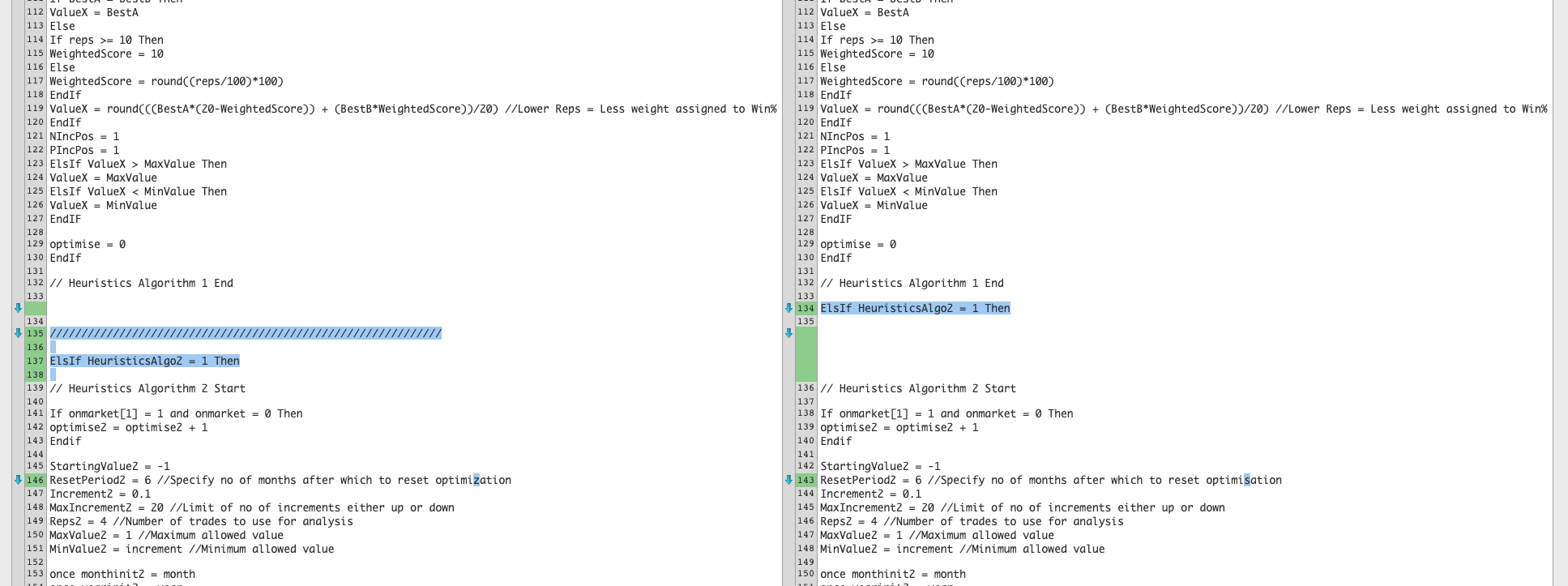 Found this, it’s free and does the job nicely: https://text-compare.com/ More troublingly the codes still looked identical but with different profit results and it’s not the system template having different spreads or dates.. but thanks to your great idea @GraHal, I found the issue. I fixed the large lineage messy spacing (left code) between the two codes as highlighted in blue in image #2 below, so the codes then “looked” the same but they still produced £21k Ehler’s Univ Osc ML2+CycLim 2 (left hand code but now all tidied up) v’s £63k Univ Osc ML2+CycLim Juanj (right hand code). The problem: see:  “<—— this cursor didn’t seem be fully returned” that I’ve written within the pasted code below. It turned out to be some kind of single backspace return problem after I’d already “fixed” the differences in messy lineage gaps shown in image #2…  Please see lines 136 and 138 (left code) and those little single blue highlights. I spent all last night and today trying to compare and figure out why these “identical” codes either wouldn’t work or why the profit was different for ostensibly the same looking and reading code and yet here we are: A backspace of one single character. I have never ever had this issue before with PRT. Is this normal and maybe I should be sweeping all my code for errant cursor spacings?