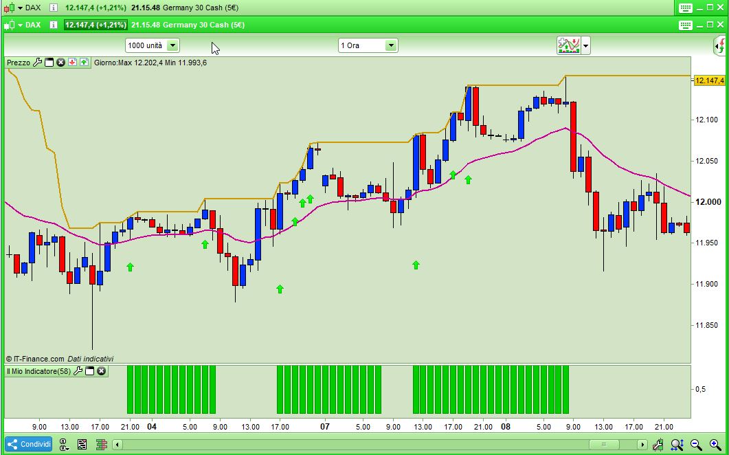 Mi spiego meglio, alle ore 15.00 ad esempio, i prezzi sfondano al rialzo i massimi delle 20 candele precedenti, qui per me scatta non l’operazione in se, ma l'”ambiente” long che sfrutterò in altra maniera, con rsi macd o altro, vorrei però che tale “ambiente long” mi si mantenesse finchè rimane inclinata positivamente la media esponenziale a 21.