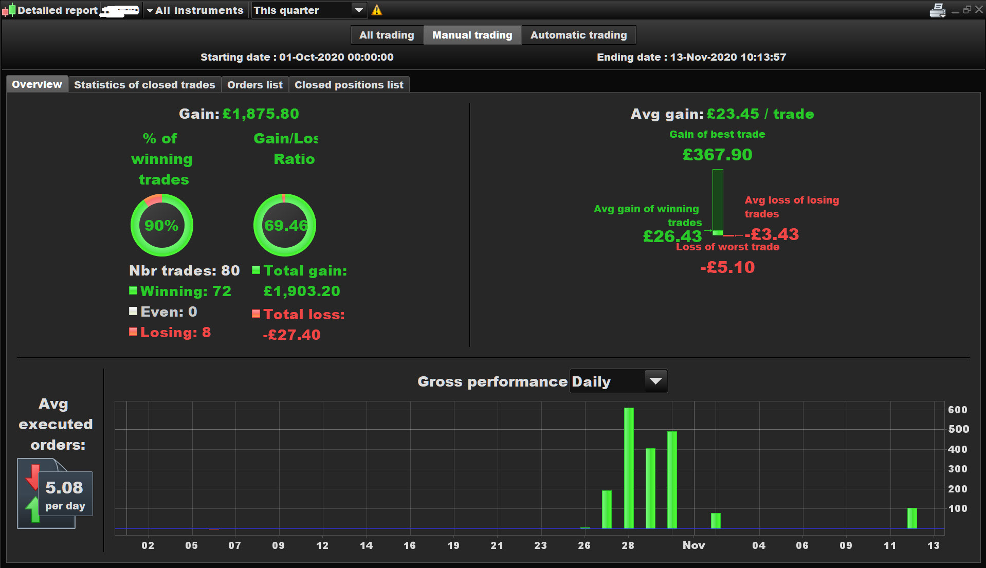 That’s very impressive, the consistency in your trading returns are exceptional. Well done. I am 95% automated, as I find the emotional side of manual trading challenging, and respect those who are able to master it!