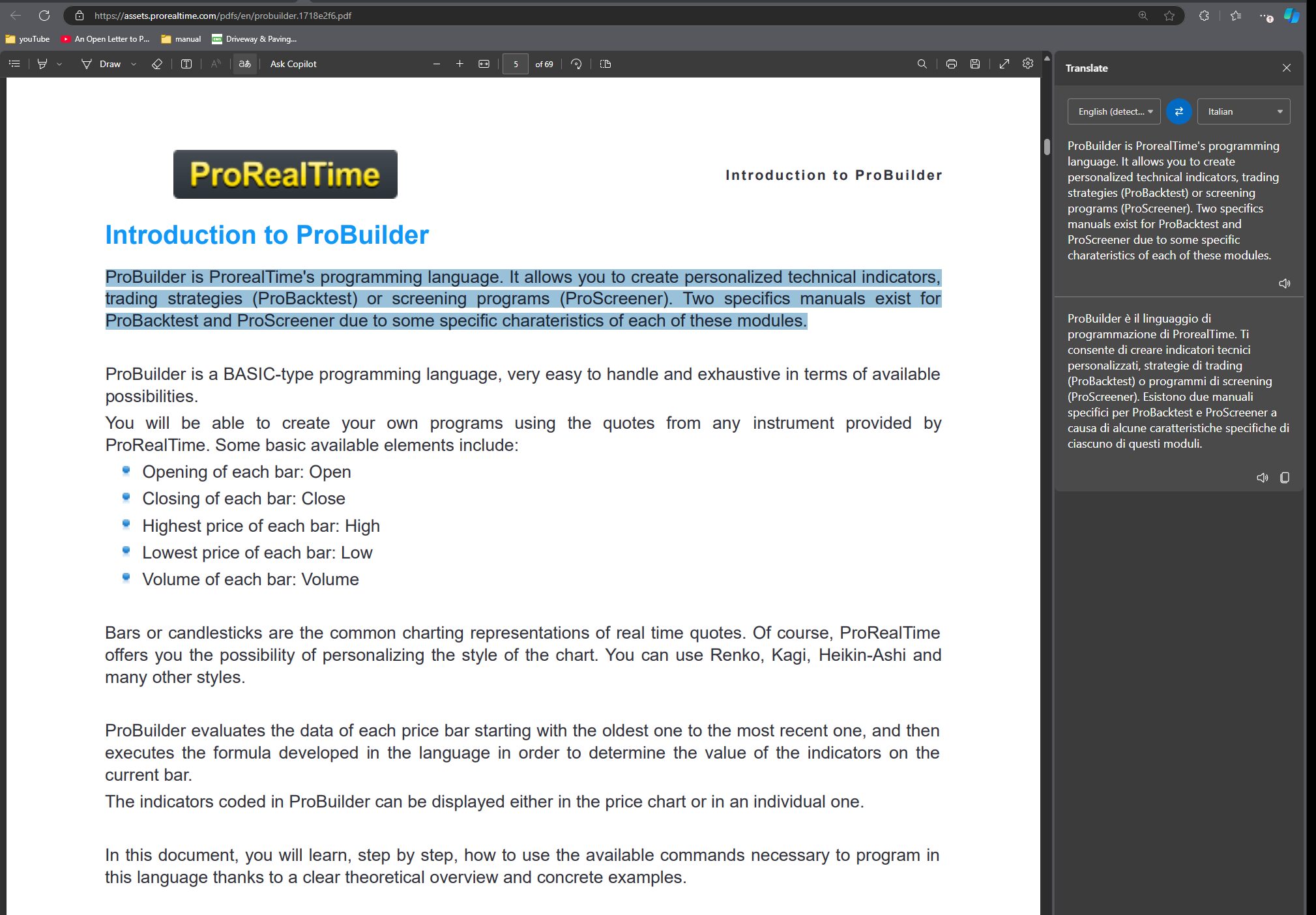 Ho cercato le istruzioni in Italiano per la programmazione della piattaforma di ProRealtime, purtroppo la trovo solamente in Inglese.