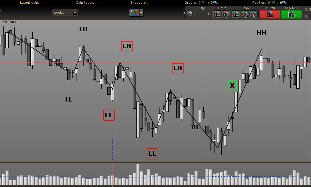 See example attached, new trend starts at X (not a great example of of a 123) where we would look out for a retracement to go long.