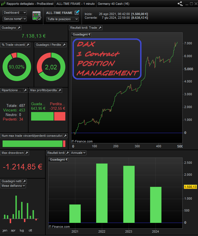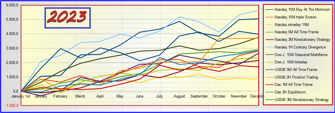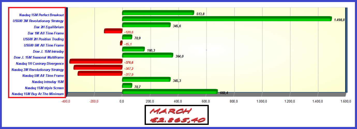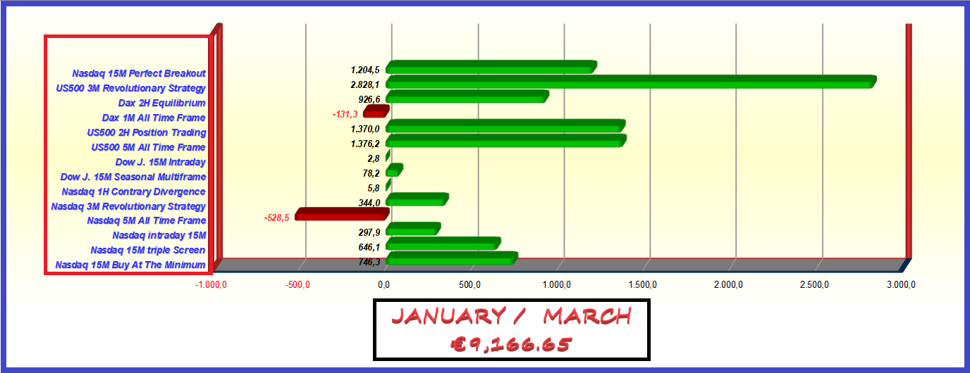 As you can see all the algorithms in the first 7 months are positive, with a minimum profit of € 279.80 of the Dax All Time Frame with a time frame of 1 minute, and a maximum of the Nasdaq 15M buy At The Minimum of € 3,049.60 (with a single contract).
