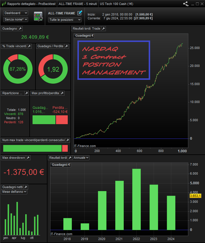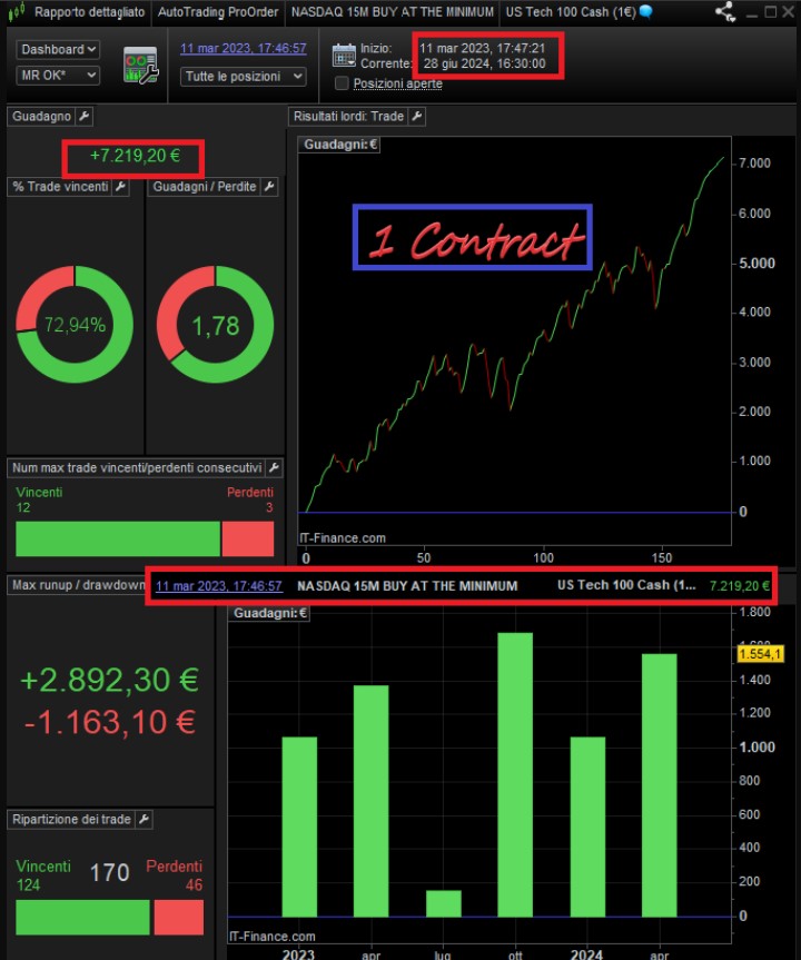 This package also includes the “NASDAQ 15M BUY AT THE MINIMUM”, where in the last year with just 1 contract you earned €7,000, active live since 15 October 2022 therefore for 19 months with a total gain of €9,230