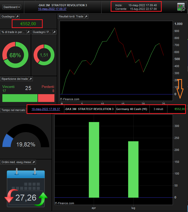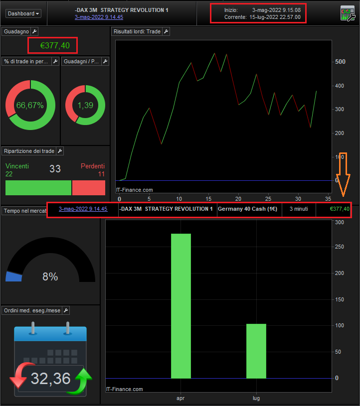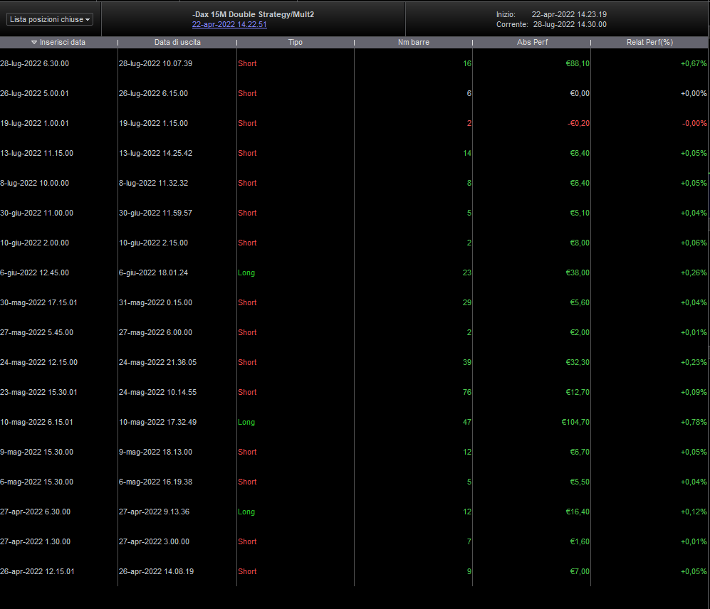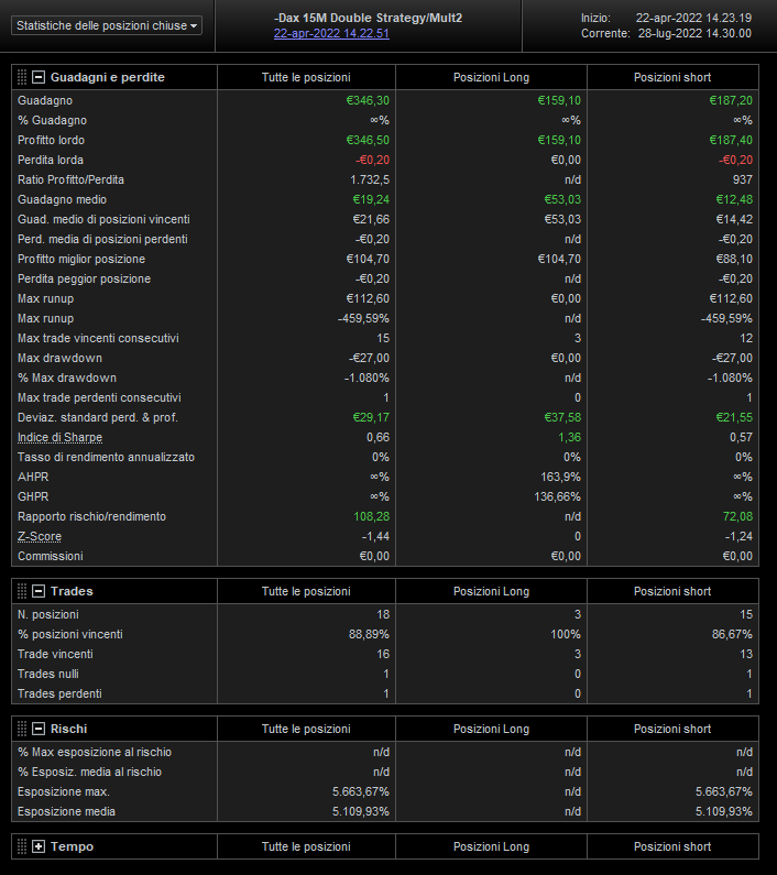 Extraordinary results of the new strategy “DAX 15M Double Strategy Multiframe” N ° 2, in just 3 months € 350 —— Perfect balance of results between the scalping of the short operations and the position trade of the Long operations —- -with only 1 € 1 contract…. 18 Trade, a single stop of ONLY 20 cents —— Safety and reliability in results.