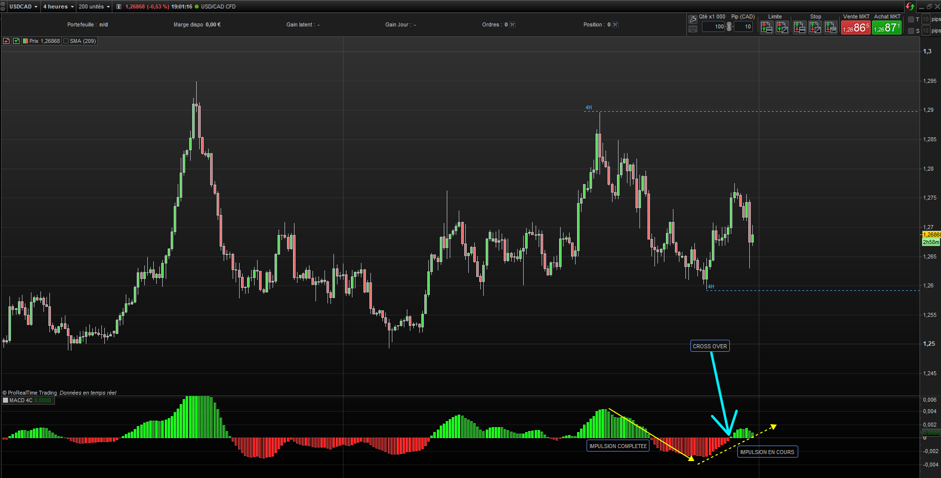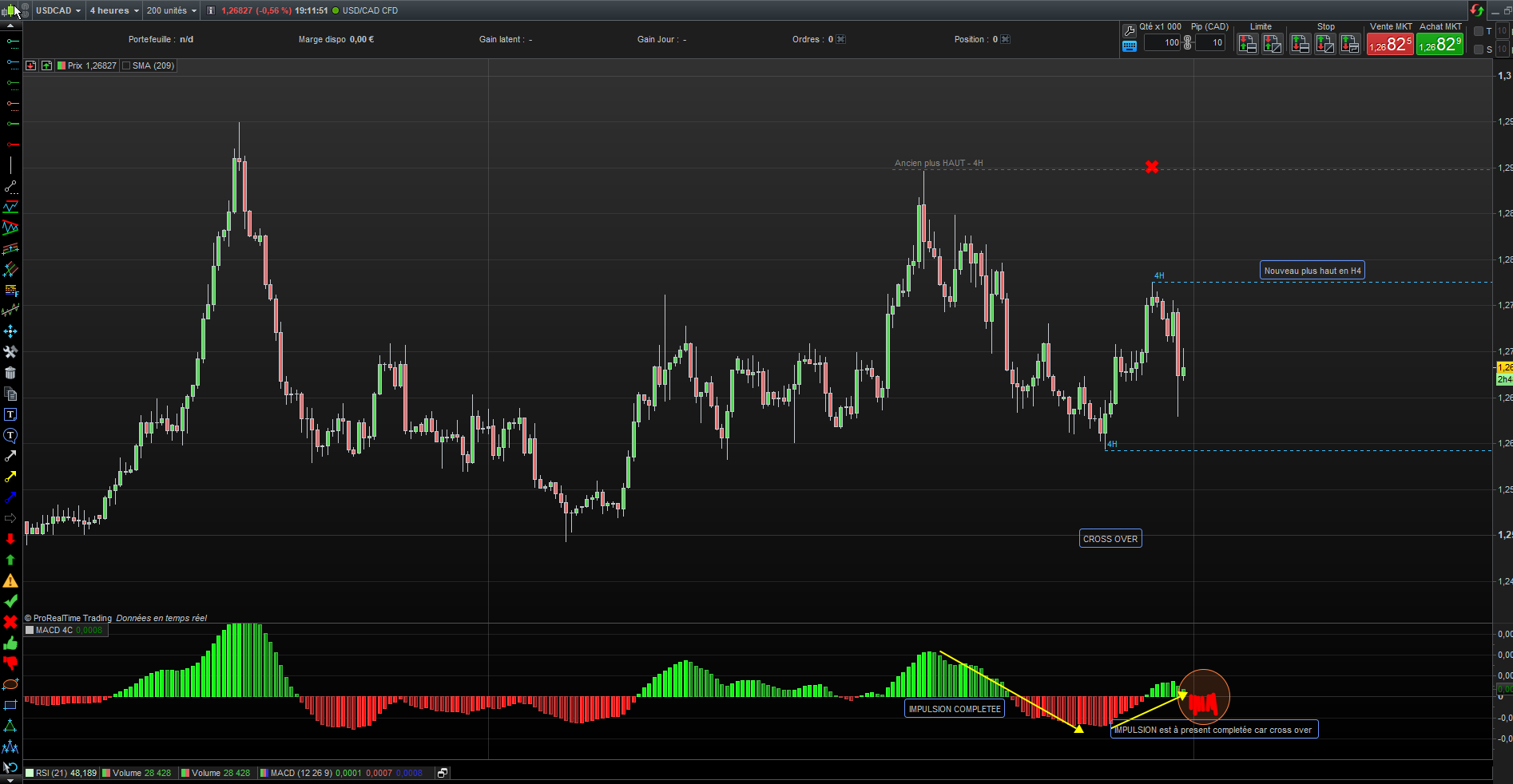 pour aller plus loin si le MACD fait un prochain cross-over c.à.d du rouge , Nous aurons donc : MACD Rouge + MACD vert + le nouveau MACD rouge ”qui vient compléter l’impulsion” alors la dernière impulsion H4 deviendra comme suit (cf.pièce jointe 2 ). et donc mes High et low devront être mis à jour.