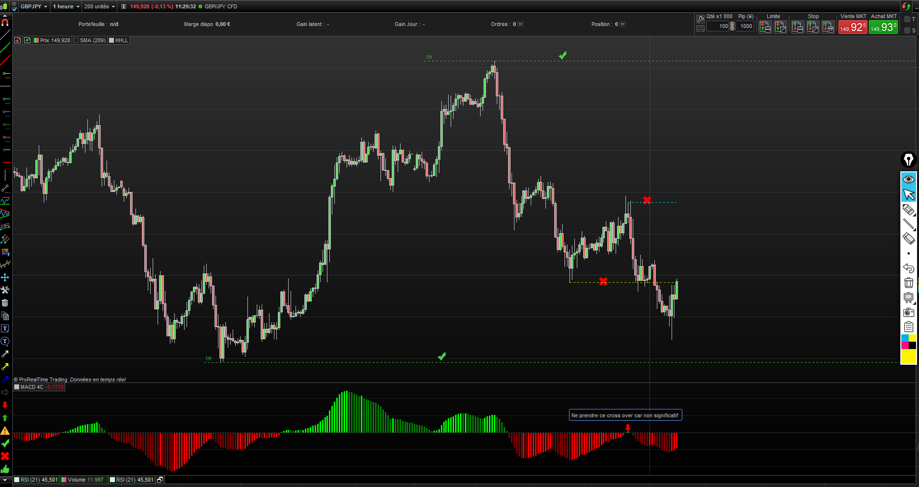 1- En testant , les Lowest et le Highest sont bon dans toutes les TF ( W,D,4H ) sauf pour le 1H , car il ne faut pas considérer le croisement lorsqu’il est constitué de 1 seule barre d’histogramme ( Cf. pièce jointe ) (pour cette modif peux tu stp indiquer dans le code quel valeur il faut modifier au cas ou c’est 2 barre de l’histogramme au lieu de 1 )