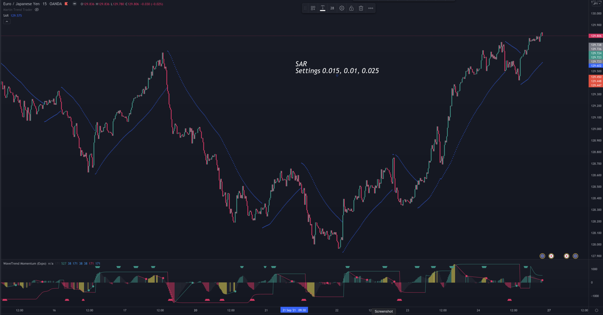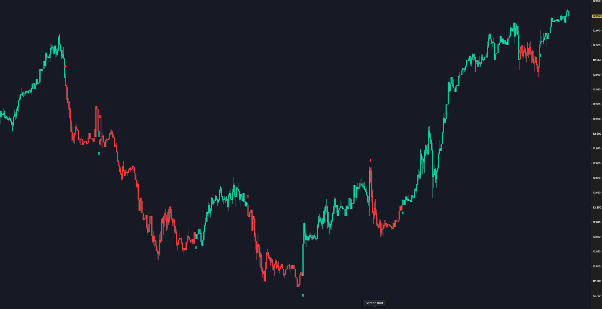 Includes the candles coloured for trend and arrows for each entry point. Based on code found on the PRC site.