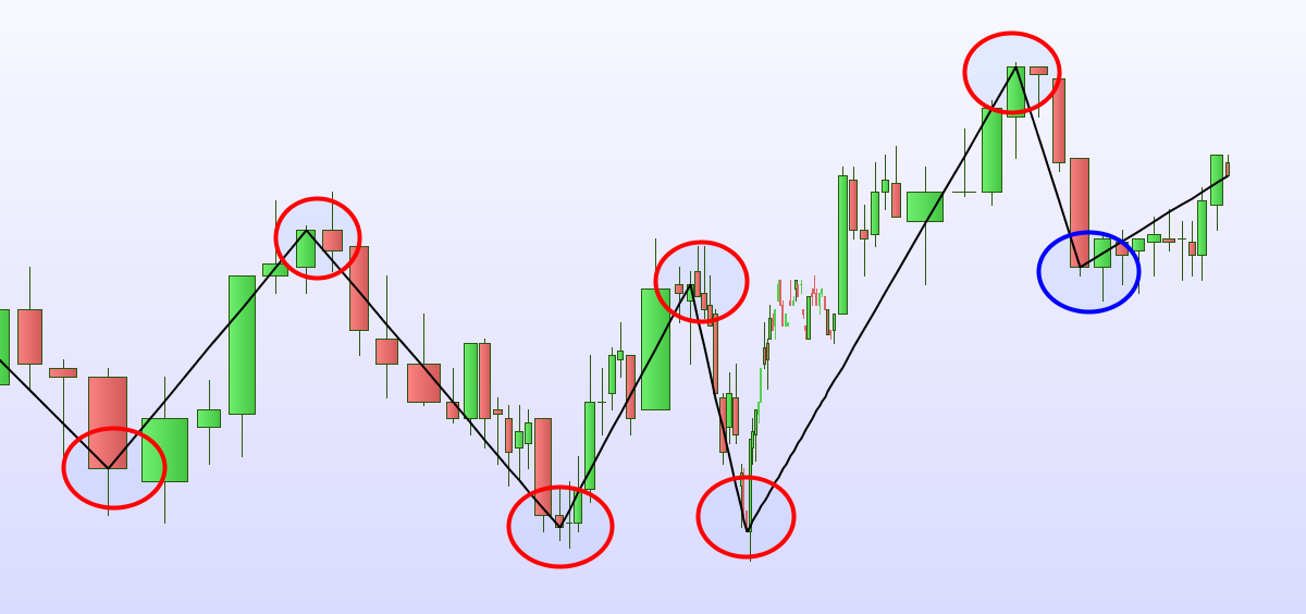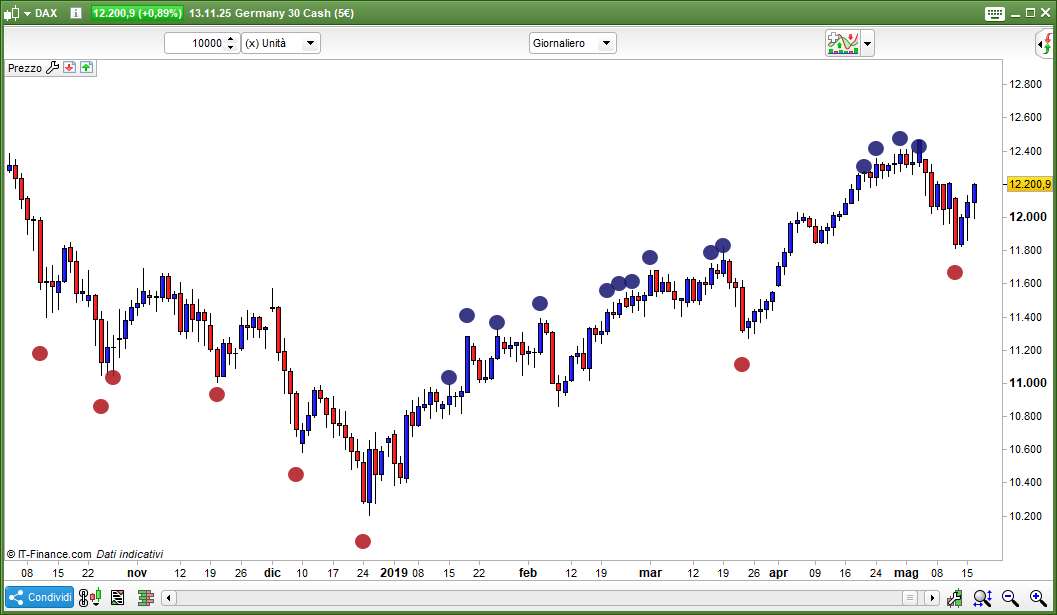 Buongiorno a tutti, mi sembra di aver capito che l’indicatore Zig Zag non è utilizzabile nelle trading system in quanto è un repainting. Lo Zig Zag nella foto allegata è impostato a variazione % e analizzandola si vedono i livelli di max/min nei cerchi rossi che sono consolidati, a differenza del minimo nel cerchio blu che invece non è definitivo e soggetto a variazione. Se il minimo nel cerchio blu dovesse superare il massimo precedente diventerebbe di sicuro un minimo consolidato perché superiore alla soglia % parametrizzata. Chiedo: volendo realizzare una strategia che entra o esce dal mercato in base alla rottura di questi livelli con variazione %, come è possibile identificarli? Necessiterei degli ultimi 3 massimi e 3 minimi. Per esempio, una delle logiche è simile all’ 1-2-3 di Ross, quello che mi occorre è proprio come identificare i minimi e i massimi. Grazie, spero di essere stato chiaro.