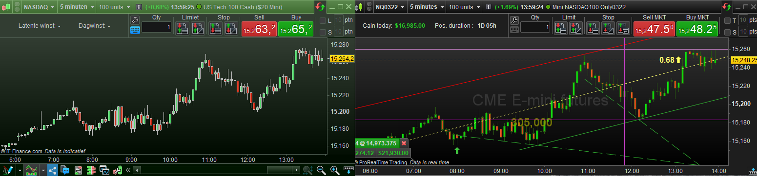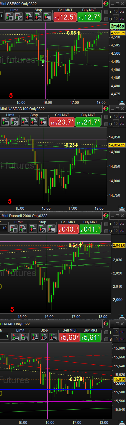 The latter is (at least for me) interesting, because I try to follow what’s going on in the world. Below you see the USA (first 3) being the same for curve (quite similar) while the bottom one (Germany) is different, but should be equal again to the AEX (not shown) and more European Futures. In this case the German(y DAX) is not the same at all for its curve, which “predicts” something for later tonight and what I really work with. Also notice that Europe has just settled (17:30 Amsterdam time) while USA does that 4.5 hours later, DAX closing at that USA settling time and USA closing at one hour later. USA reopens again 1 hour later (00:00 my time) the DAX again 1h15 later (01:15). AEX and the others next morning 08:00. All work into each other, and throughout a day many things happen because markets open. Let’s say it brings you a lively day, each day again. And one can really earn money when keen on those matters/subjects.