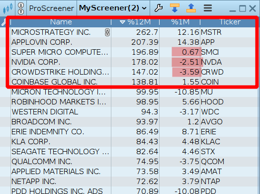 Buongiorno volevo codificare uno screener che dato un paniere di asset con carattere mean reverting mi vada a selezionare come primo step i 6 più forti per valore percentuale a 12 mesi e in seconda battuta i 3 più deboli per variazione percentuale nell’ultimo mese.