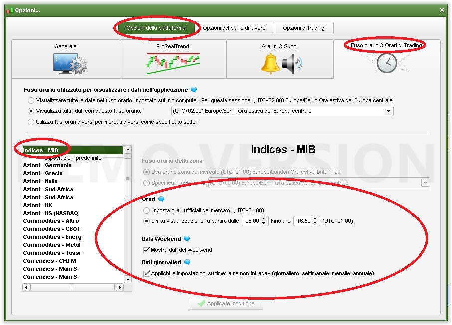 Forse c’è una soluzione. Prova ad andare (su ProRealTime ovviamente) nelle “Opzioni della piattaforma”, da li passa al tag “Fuso orario”, cerca “Indices MIB” e poi metti gli orari e le spunte come ho indicato io sull’immagine allegata. ATTENZIONE però, PRIMA scriviti i dati esattamente com’erano o, meglio ancora, fagli una foto col cellulare se non hai la possibilità di salvare la schermata. In tal modo potrai ripristinare all’occorrenza eventuali modifiche che risultano errate.