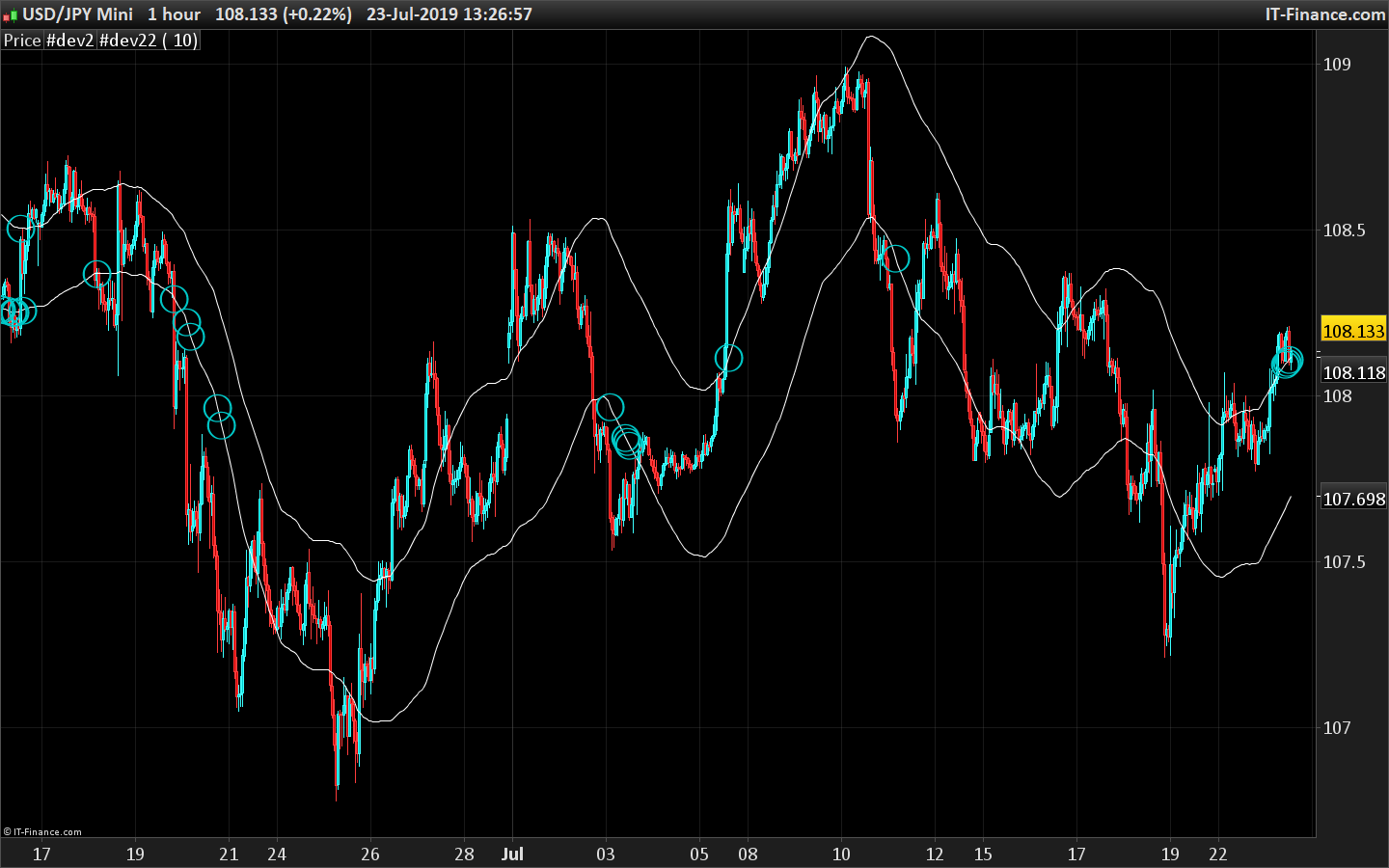 Si le close est au dessus de la moyenne 50, alors on trace un cercle sur la bande haute et inversement si dessus la MA50.