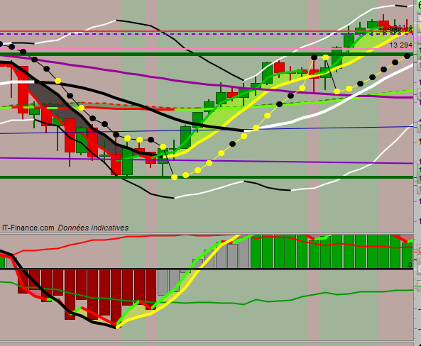 Pour le dax en ce moment, il y a un hors boll LD (Lower boll Daily) – et MW (Mid boll Weekly) a été cassée car LD = +/-MW