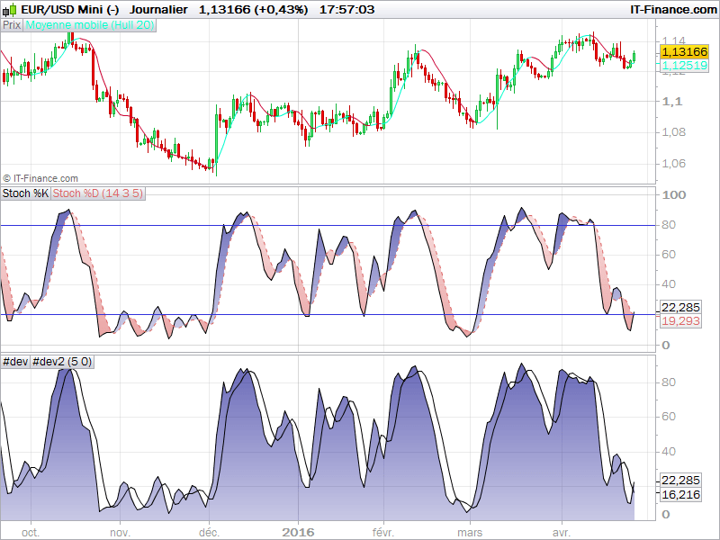 La ligne de signal d’un oscillateur stochastique est en effet une simple moyenne mobile de l’oscillateur. Pour lisser la stochastique on peut utiliser n’importe quel type de moyenne en y injectant sa valeur au lieu du Close du prix par exemple.