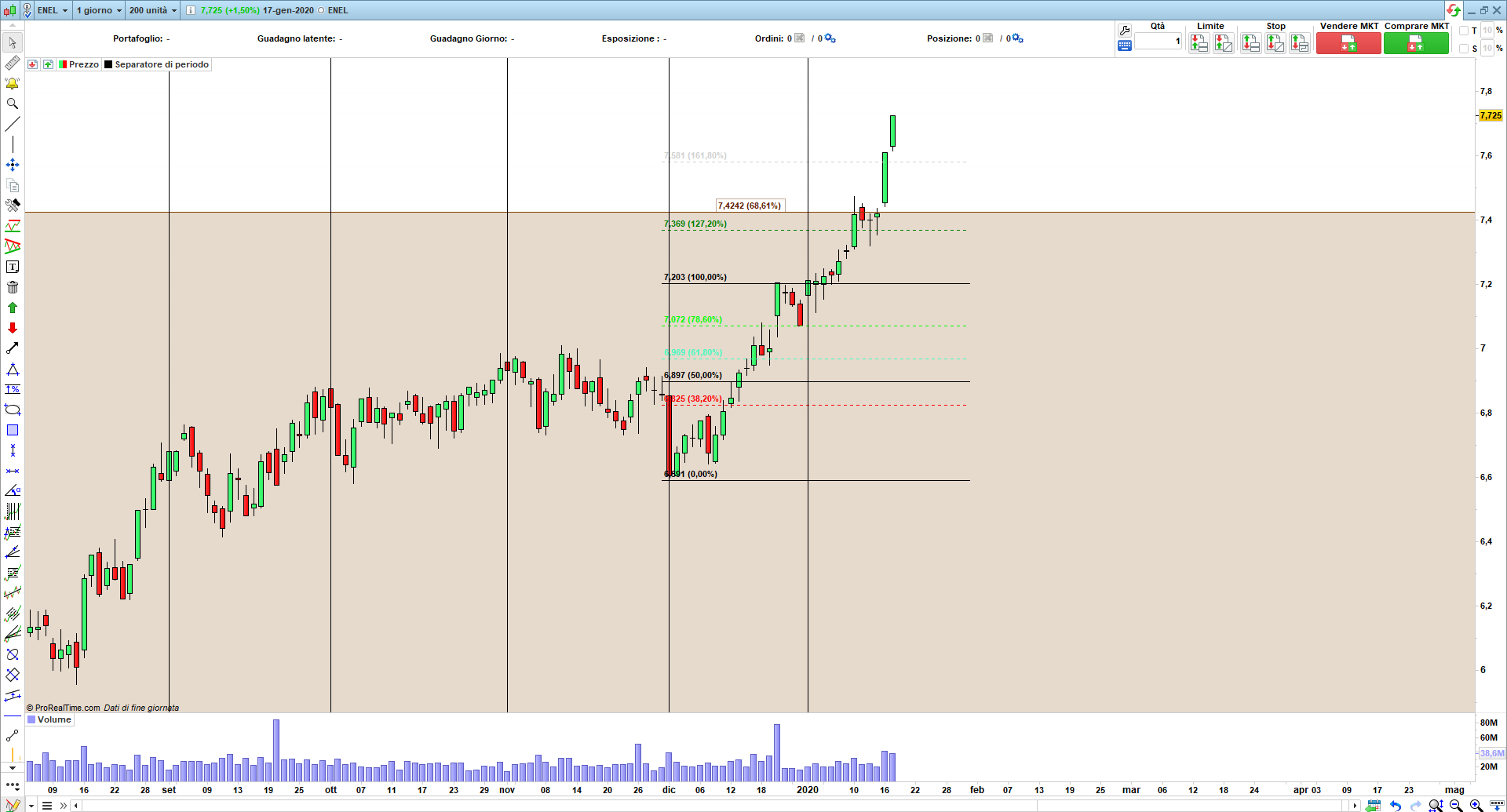 In effetti ho provato anch’io su GENERALI e fa un bel casino, traccia le linee non so bene da dove, sembra funzioni bene solo sul grafico MENSILE. Di questo però devi fare una segnalazione a PRT premendo CTRL+M dalla piattaforma.