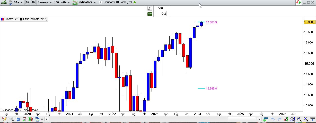puoi usarlo su qualunque grafico inferiore all’annuale (Settimanale, Giornaliero, 4 ore, ecc…), purché sul grafico ci siano un numero sufficiente di barre, ad esempio sul grafico orario occorrono almeno 15-16000 unità, sul 5 minuti 5 volte meno, su 1 minuto NON è possibile, perché il massimo numero di unità disponibili è 200000 e corrispondono a poco più di 6 mesi, mentre ti servono praticamente due anni, perché l’anno precedente inizia dall’1/1/2023, ma dovrai stamparlo sul grafico fino al 31/12/2024.