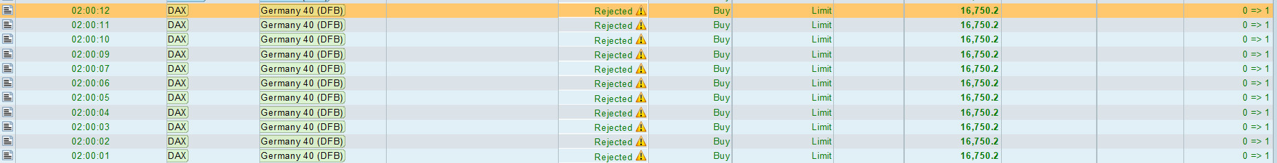What I did prior to that “Not Monitor” state feature, was creating a dead zone myself (don’t trade during that hours). Once you know it will fail anyway in a certain period, you could do that too. For the DAX I would think that your virtual dead zone may end at 06:00 (your time), so nothing much will happen at night. Personally I would exclude the opening from that and accept the larger distance (10 points ?) for that moment and for the first 5-10 minutes.