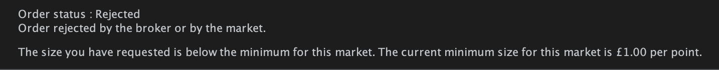 I am trying to run a new strategy on spread-bet demo and keep getting rejected. I like to run the smallest size possible, which I believe to be £0.05 per point on DJI (see attached screenshot taken from IG), however in the PRT order list it gives £1 per point as the minimum.