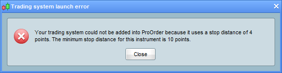 After clicking “Prepare for Automated trading”, I receive the error “Your trading system could not be added into ProOrder because it uses a stop distance of 4 points. The minimum stop distance for this instrument is 10 points.” (See attached image).