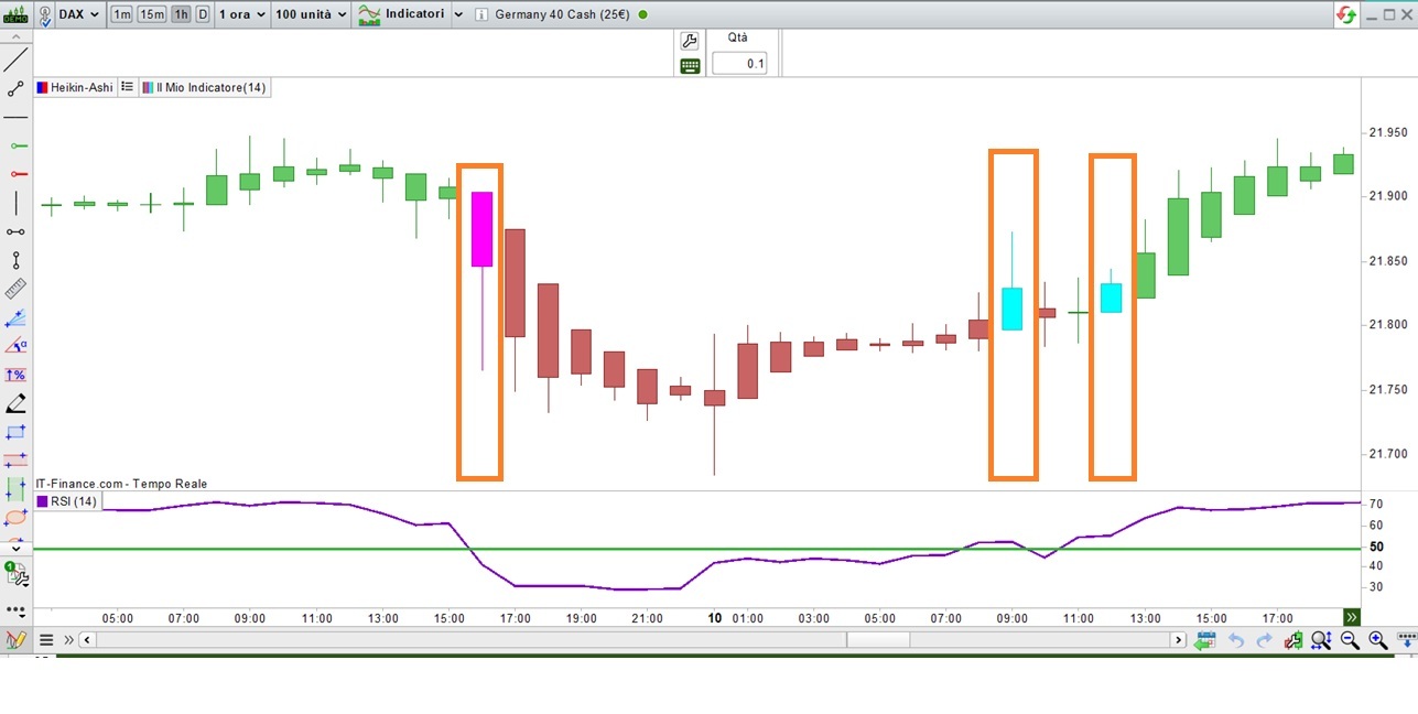 vorrei chiedere cortese modifica del codice in oggetto, nel quale le candele Heikin Ashi cambiano colore quando RSI supera il valore di 50 (da rosso a verde e viceversa).