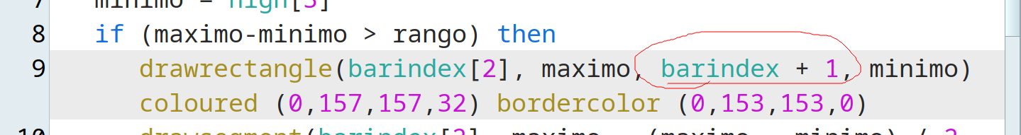 drawrectangle(barindex[2], maximo, barindex + 1, minimo) coloured (255,0,0,32) bordercolor (255,102,102,0)