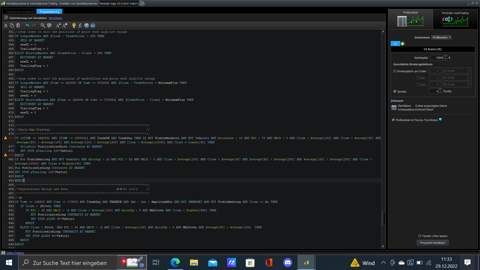 Der Handelscode ist zB explizit auf den DAX gemünzt. Kursbewegungen im DOW sehen doch tlw deutlich anders aus…