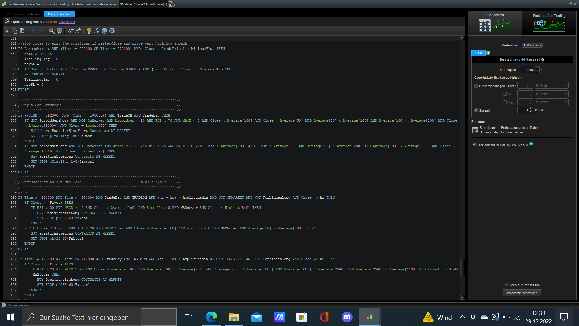 Die Ergebnisse für den DOW sind natürlich noch bescheiden, weil ich die optimalen Werte wie zB Trailing-Abstände etc gar nicht wirklich ermittelt habe. Ich habe zwar die Codebasis vorbereitet und “geschätzte” Werte schon mal eingetragen, aber mich noch nicht wirklich intensiv damit beschäftigt (das wäre dann ggf eine Aufgabe für jemanden, der den DOW handelt! 😉 ). Ich selbst handele tatsächlich als Scalper/Daytrader im 1m-DAX.